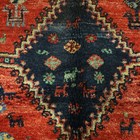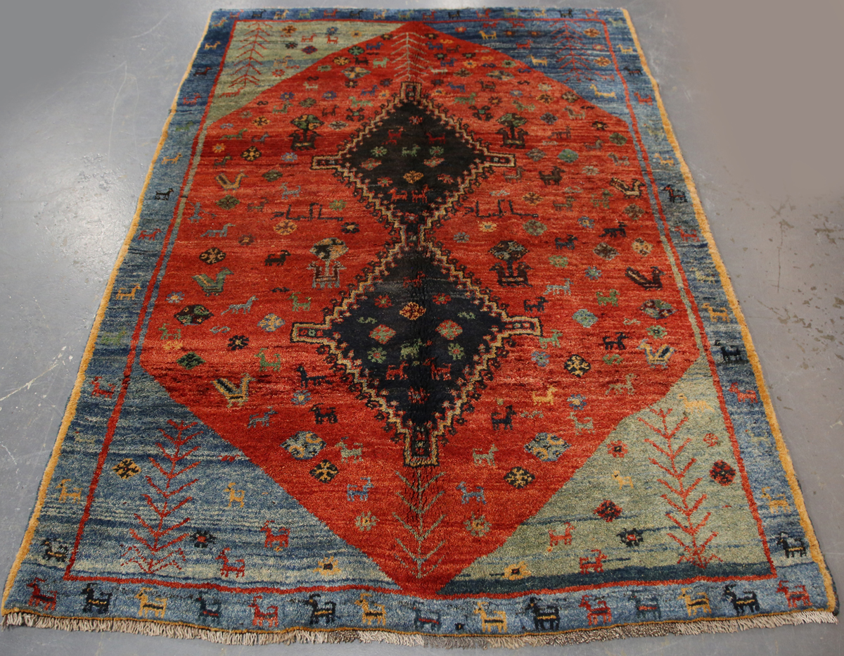 A Persian gabbeh rug, late 20th century, the red field with twin linked medallions supported by figures and animals, within a blue complimentary border, 228cm x 165cm.