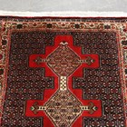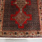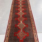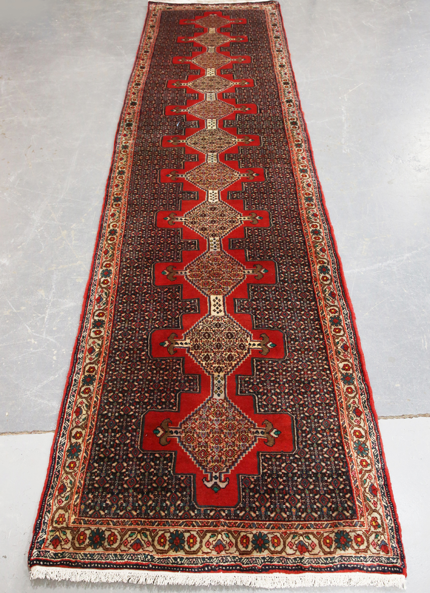 A Senneh runner, South Persia, late 20th century, the red field with a column of medallions, within a flowering vine border, 405cm x 96cm.