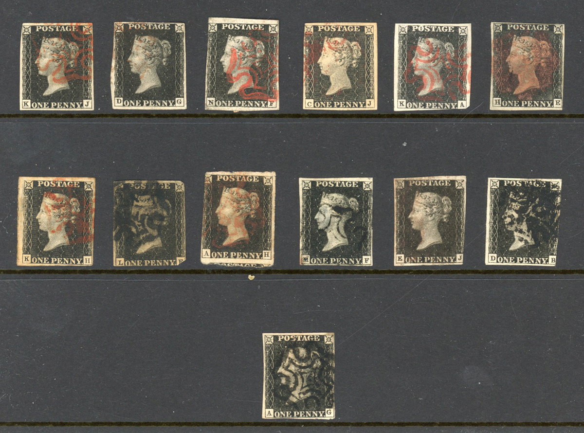 Great Britain thirteen 1d black stamps, cut into or cut close and some various faults.