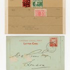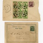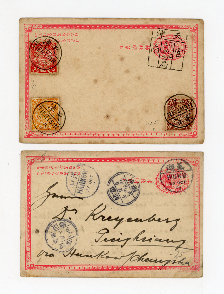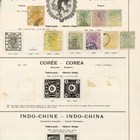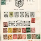 China stamps and covers on leaves in folder from 1878 5 candareens used, 1897 1 cent red revenue unused, plus China and Japan stationery cards used (mixed condition).
