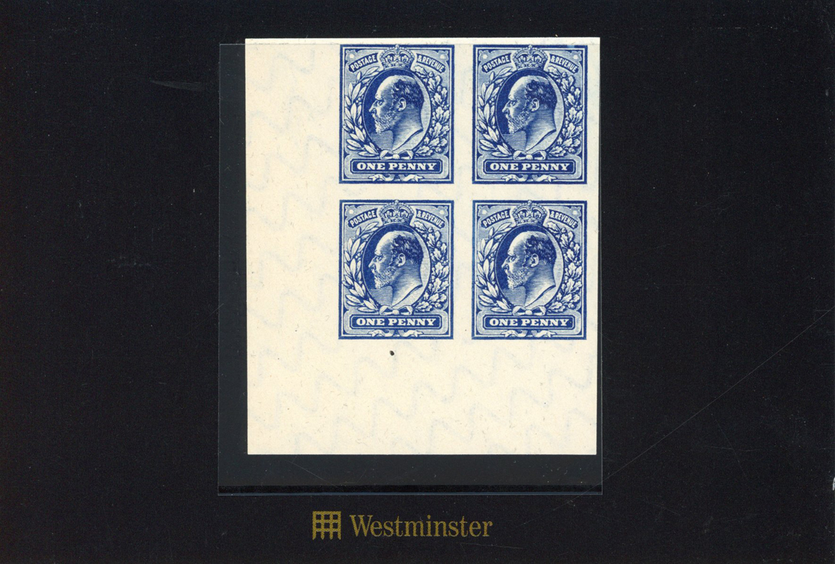 Great Britain Edward VII 1913 1d trial stamp by Bruckmann Printers of Munich, unissued in corner block of four and single.