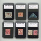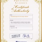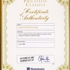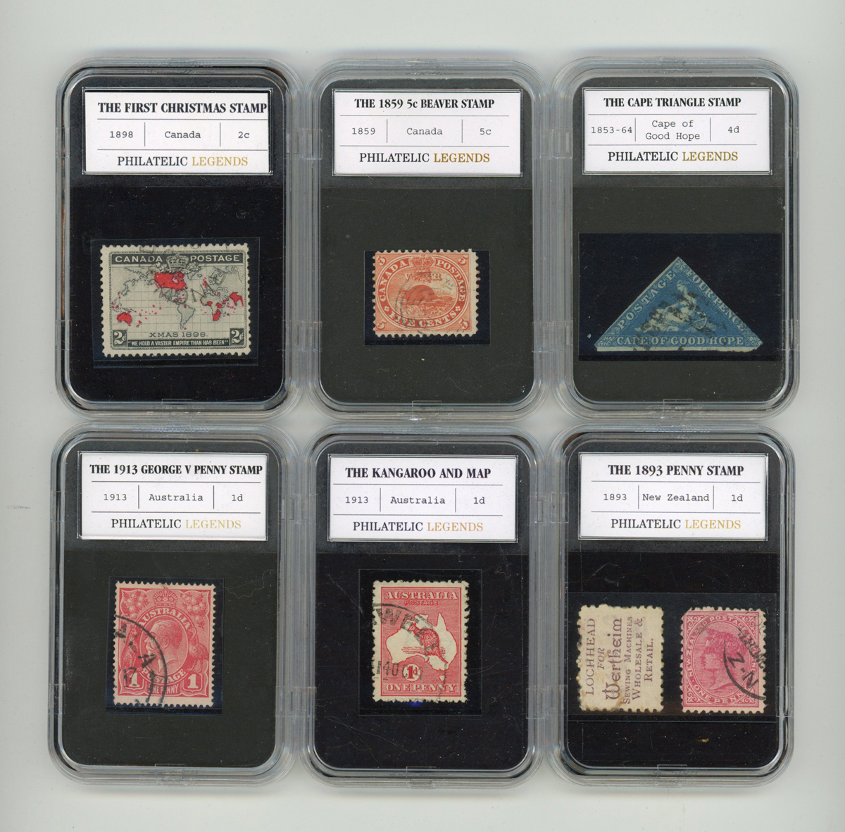 Westminster folders (2) and presentation box (2) Philatelic Legends' with Cape of Good Hope 4d used, Canada 1859 5 cents, USA 24 cents airmail, War Tax stamps.