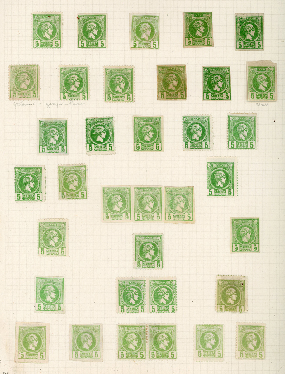 Greece specialised written up stamp collection in six early albums with study of Large and Small Hermes Heads from 1861 Paris prints up to 1911, with mint and used, plate varieties, some blocks, few covers, 1900 surcharges, 1896 Olympics - 10 drachma (torn), 1906 Olympics mint set, mixed condition with some affected by damp.