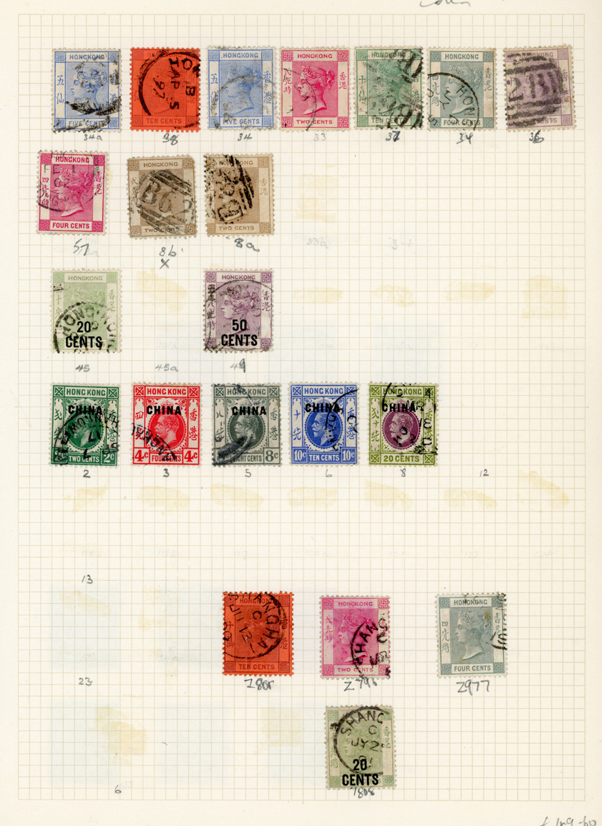 Hong Kong stamps in album, on stock cards, on leaves, auction folders with 1862 2 cents-24 cents used, surcharge overprints, 1891 2 cents Jubilee used, unmounted mint blocks George V and George VI, Trenty Ports postmarks and China overprints with mint blocks.