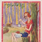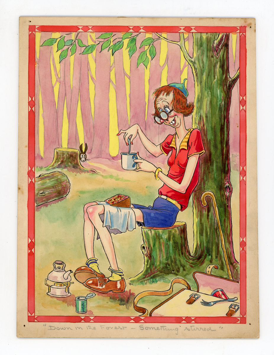 An original watercolour and ink by Dudley Buxton for the postcard ‘Down in the Forest, Something Stirred’, 23cm x 17cm, together with an Isle of Man Disapproved Censorship signed postcard and an archival card of the finished postcard.