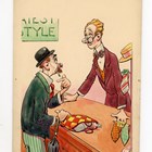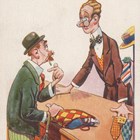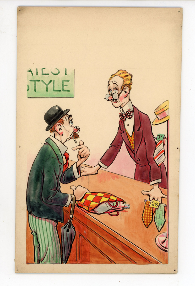 An original watercolour and ink by Dudley Buxton for the postcard ‘What Size Collar?’, 24cm x 15cm, together with the original Inter-Art Co published postcard.