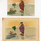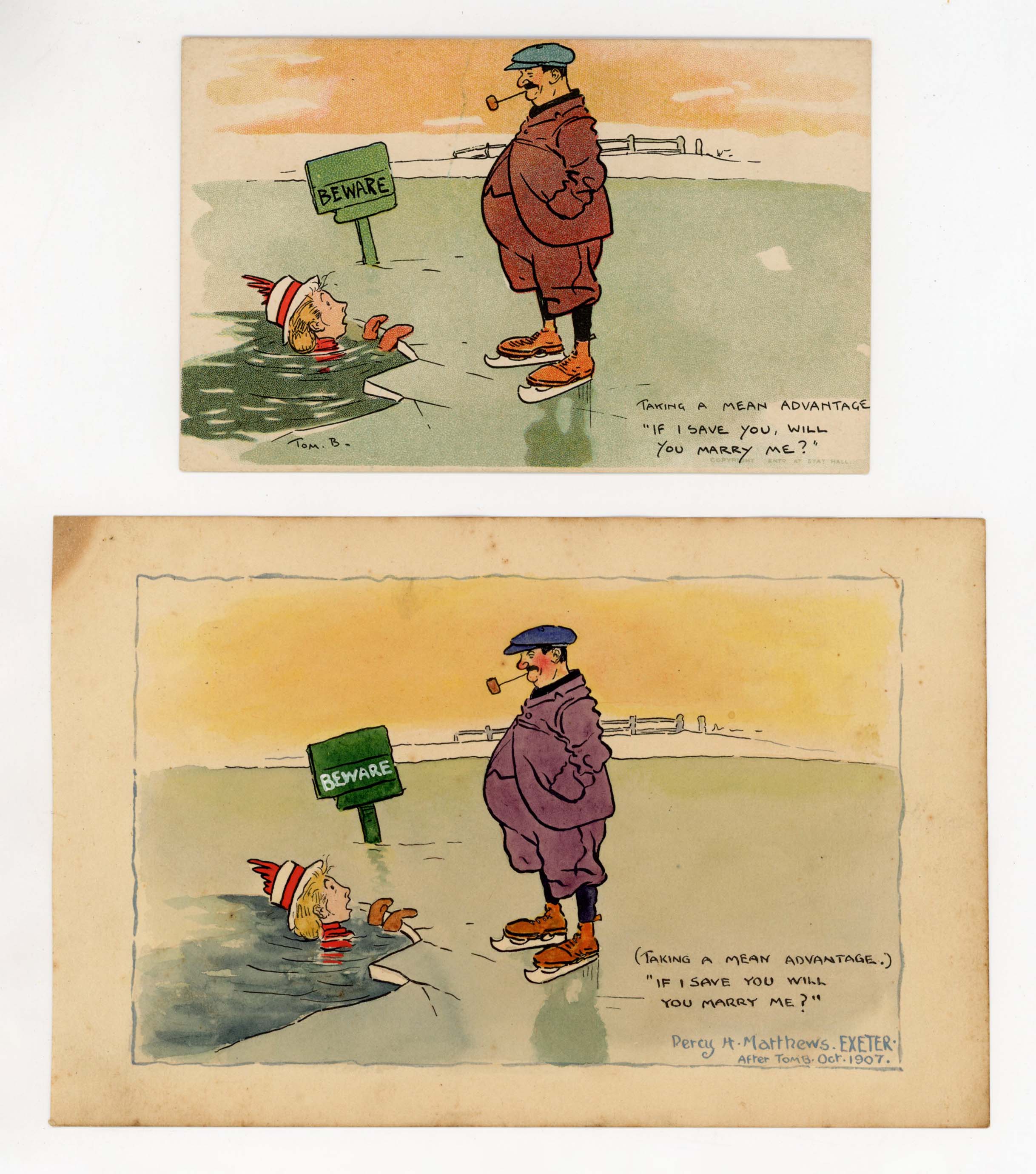An original watercolour and ink by Percy H. Matthews of a Tom Browne postcard titled ‘Taking a mean advantage’, signed, titled, inscribed and dated 1907, 12cm x 19cm, together with the original postcard.