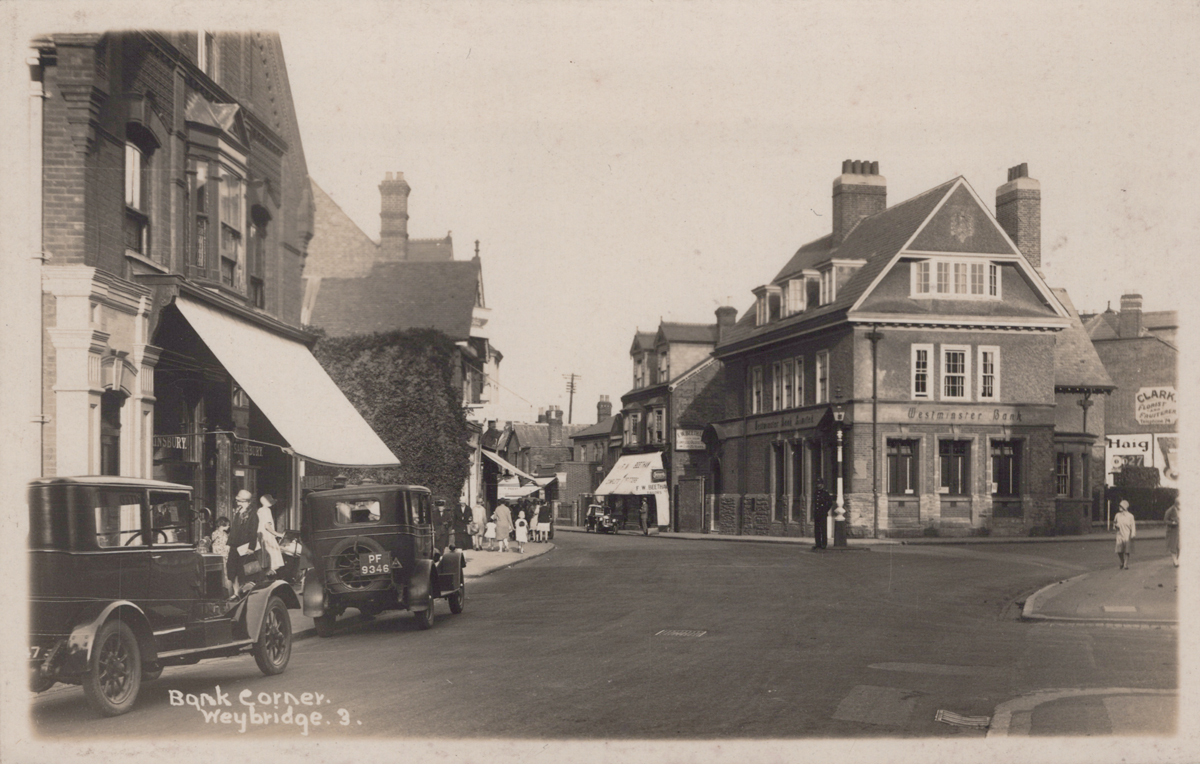 A collection of approximately 65 postcards of Weybridge, Surrey, including photographic postcards titled ‘Bank Corner, Weybridge’, ‘High Street, Weybridge’, ‘Church Street, Weybridge’, ‘Baker St, Weybridge’, ‘Heath Road, Weybridge’, ‘Cricket Common, Weybridge’ and ‘Recreation Ground, Weybridge’.