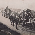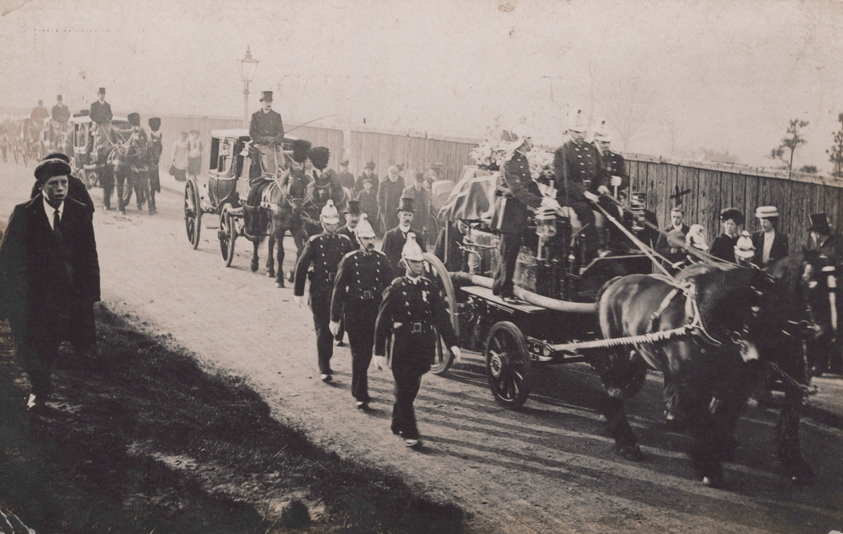 A group of nine photographic postcards of Aldershot, Hampshire, comprising four relating to the ‘Funeral of the Late Firemen Hughes and Perkiss’, three of the fire at Gale & Poldens, and two of the fire at Miles & Miles.