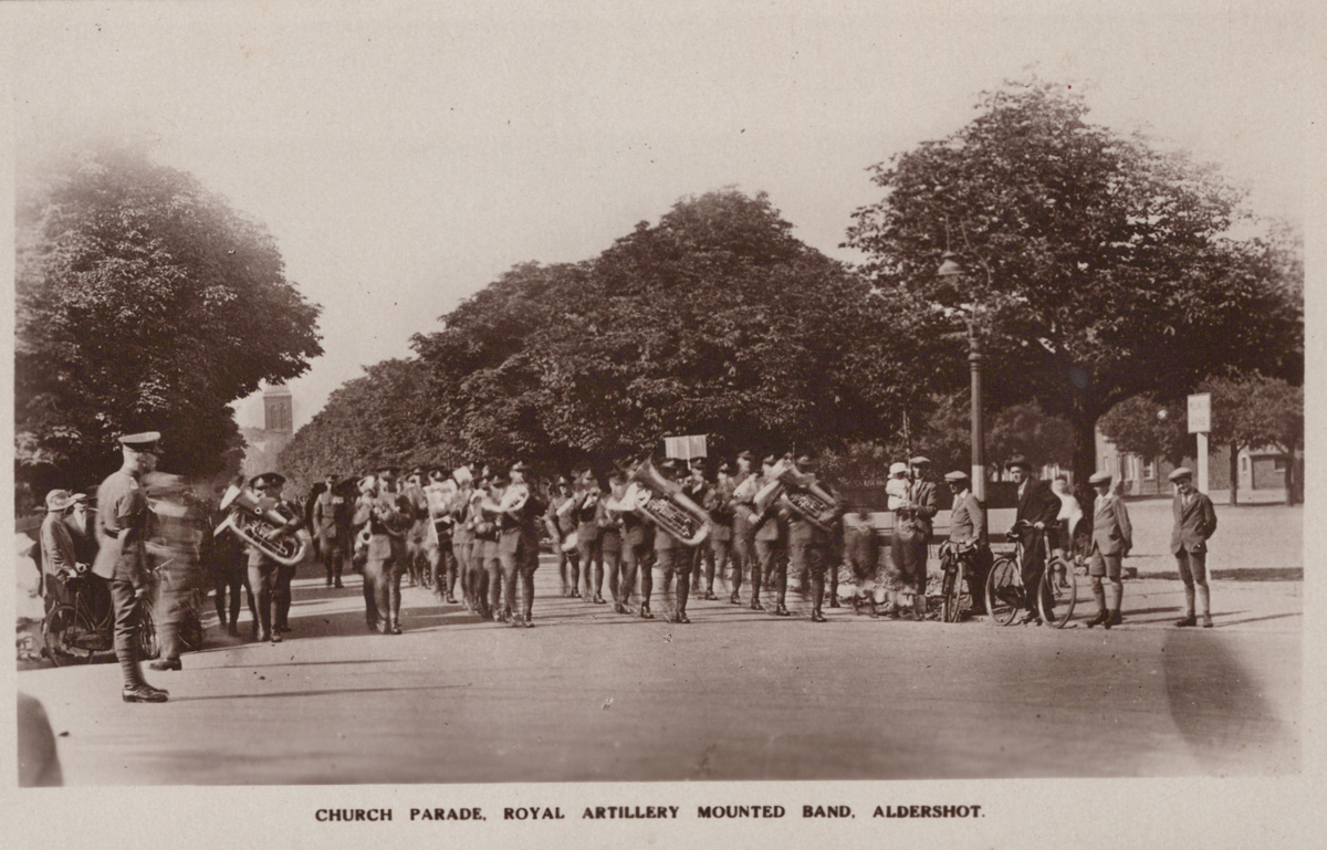 A collection of approximately 59 postcards of Aldershot, Hampshire, the majority of military interest, including photographic postcards titled ‘Royalty Parade, Royal Artillery Mounted Band, Aldershot’, ‘Public Schools, Aldershot’, ‘Wellington Avenue, Aldershot’, ‘K.R.R. Church Parade, Aldershot’, ‘Queen’s Avenue, South Camp, Aldershot’ and ‘N.C.O. Mess, Royal Engineers’.