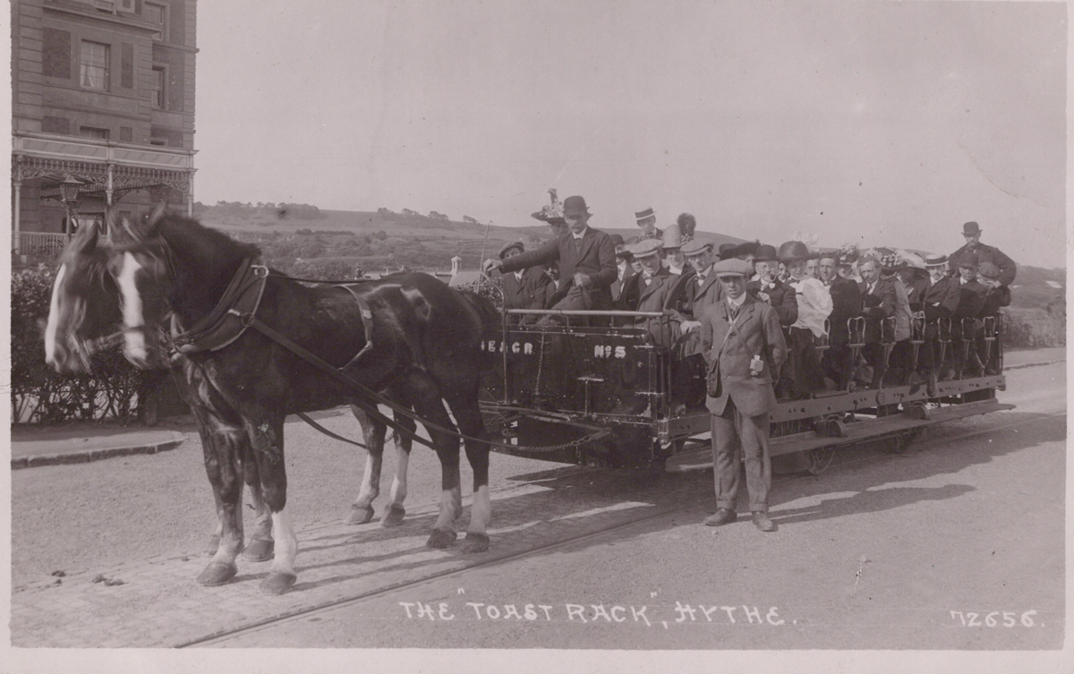 A collection of 58 postcards of Hythe, Kent, including photographic postcards titled ‘The Toast Rack, Hythe’, ‘Guest House, Moyle Tower, Hythe’, ‘Hythe Canal from Ladies Walk Bridge’ and a group relating to Beating the Bounds at Hythe.