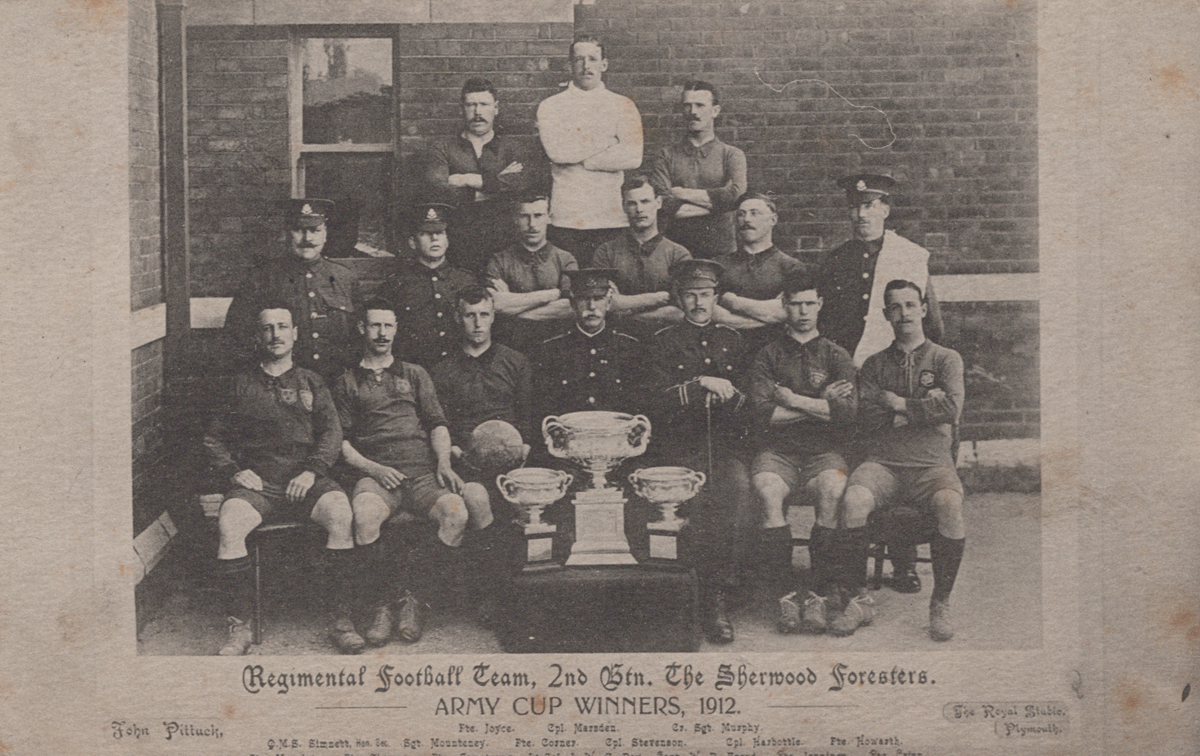 Four albums containing approximately 380 postcards, the majority of military interest, including some published by Gale & Polden, Raphael Tuck, and Daily Mail, two embroidered regimental silk postcards, group portraits, and others titled ‘Regimental Football Team, 2nd Btn. The Sherwood Foresters, Army Cup Winner 1912’, ‘Colonial Coronation Contingents Camp, Duke of York’s School, London’, ‘Lieut. William Leefe Robinson, V.C.’, and ‘2nd Batt Royal Warwickshire Regt, The Battalion’.