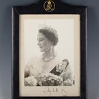 ROYALTY. A mounted black and white presentation photograph of Queen Elizabeth, the Queen Mother, by Cecil Beaton, 19.5cm x 15cm, signed below the image and dated 1964, within original black morocco leather easel frame by Jarrolds of Knightsbridge.