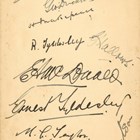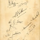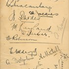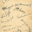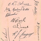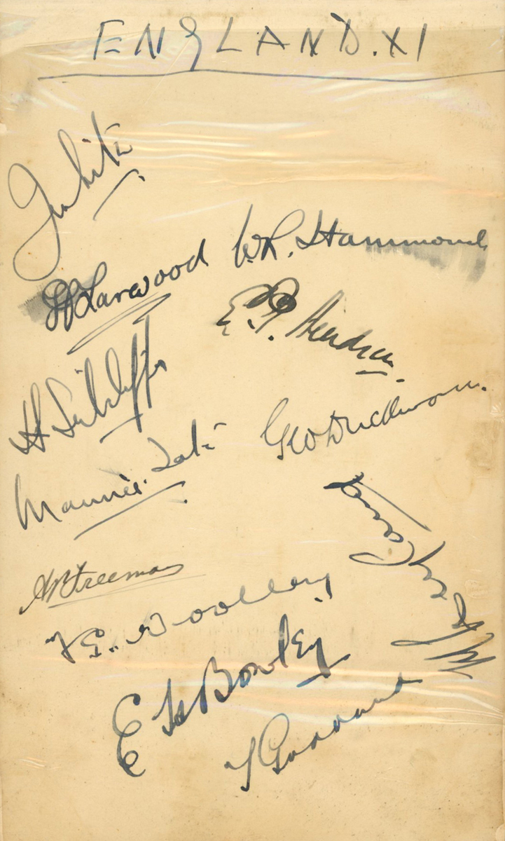 AUTOGRAPHS. An album of cricket autographs, circa 1920s, most with a team to a page, leaves 9.5cm x 16cm, including pages headed 'England XI' with Wally Hammond, Herbert Sutcliffe, George Duckworth, Frank Woolley, and others, 'Surrey C.C. 1928' with Jack Hobbs and others, 'Derbyshire XI', and 'South Africa, Leeds 1929'.