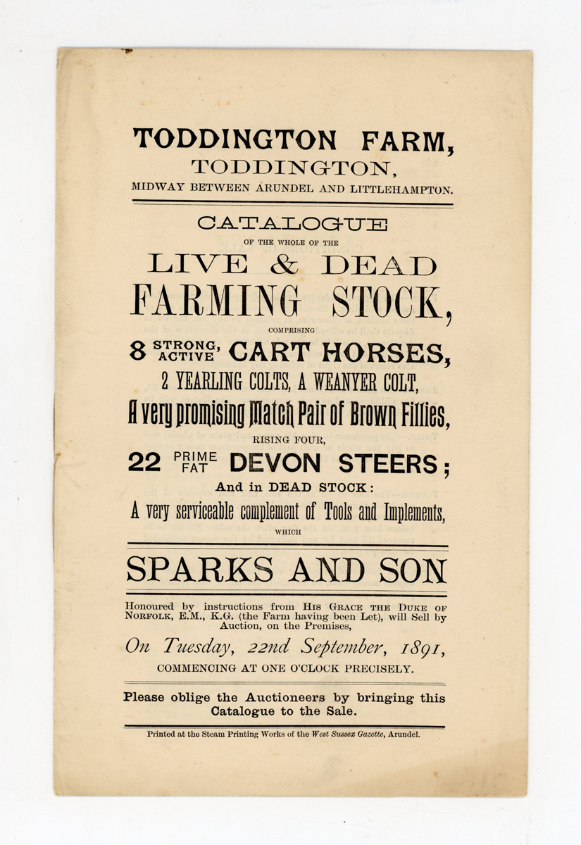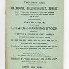 SUSSEX. A group of six auction catalogues for farming stock sales in Sussex, circa 1891-1907, 21.5cm x 14cm, together with property particulars for Hillside Farm in East Grinstead.