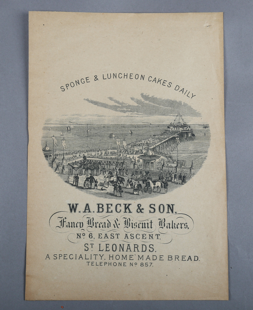 SUSSEX. A collection of ephemera relating to Sussex, the majority of advertising interest, including a printed advert for Pescod Brothers of Midhurst, another for W.A. Beck & Son of St Leonards, letterheads and receipts, together with share certificates for Tamplin & Sons, Brewery, Brighton.