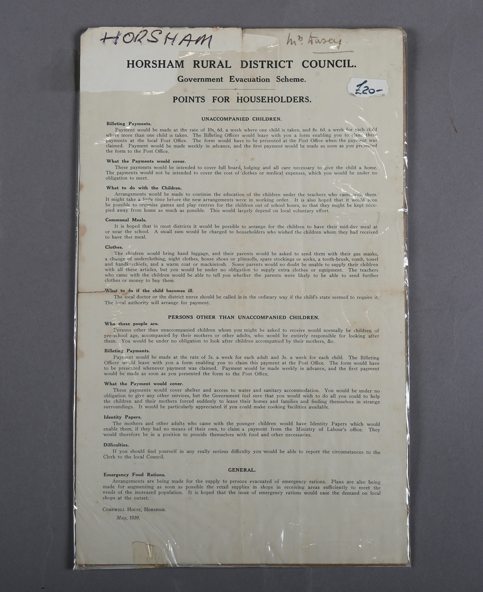 SUSSEX. A collection of various ephemera, the majority relating to Sussex, including a ‘Horsham Rural District Council Government Evacuation Scheme’ dated May 1939, an ‘East Grinstead Football Club Programme, Season 1958-1959’, a ‘Guide Book and History of Potter’s Museum and Exhibition, Bramber, Sussex’, ‘Rules of Court Rural No 5058 of the Ancient Order of Foresters held at the Rising Sun Inn, Nutbourne, near Pulborough’, a faux newspaper titled ‘Great Anti-Corporation Dinner at the Old Ship [by a Special Reporter]’, a rent book relating to Hastings and various programmes.