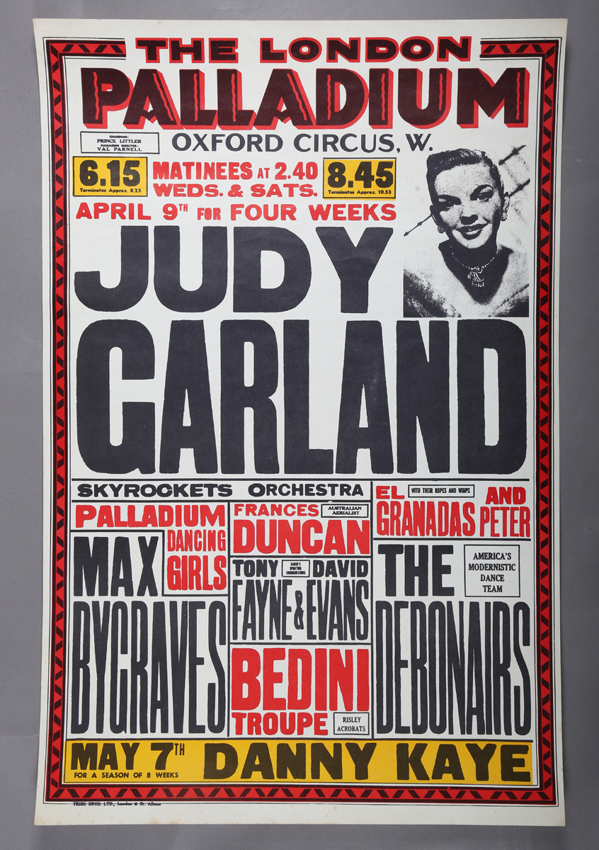 POSTER. A London Palladium poster advertising performances by Judy Garland, 75cm x 49cm, printed in black, red and yellow.
