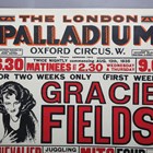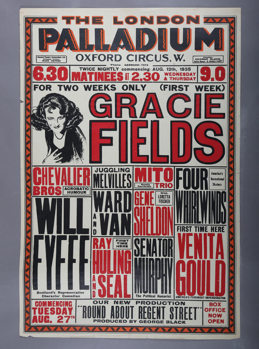 POSTERS. Three London Palladium posters advertising performances by Gracie Fields, each 76cm x 50.5cm, printed in red and black with orange or yellow.