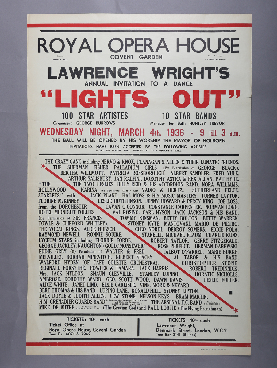 POSTERS. A folio containing 25 posters advertising performances at various theatres, including The London Palladium, Prince of Wales Theatre Coventry, Manchester Hippodrome, Alexandra Theatre Stoke Newington, Elephant and Castle Theatre, Shepherd’s Bush Empire, Battersea Palace, and Barnard’s Theatre, most 76.5cm x 50.5cm.