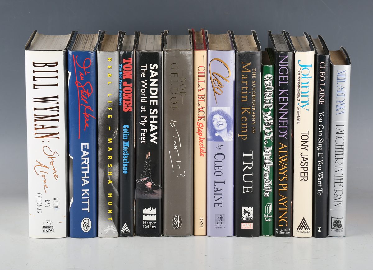 AUTOGRAPHS. A collection of fourteen signed modern first edition books, including ‘Stone Alone’ signed by Bill Wyman, ‘I’m Still Here’ signed by Eartha Kitt, ‘Real Life’ signed by Marsha Hunt, ‘The Boy From Nowhere’ signed by Tom Jones, and ‘The World at My Feet’ signed by Sandie Shaw.