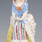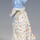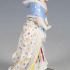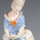 A Meissen figure, late 19th/early 20th century, modelled after Acier, as a girl looking down at a broken mirror at her feet, raised on a circular base with raised gilt scroll pattern to the edge, crossed swords in underglaze blue to base, incised model No. F.34 and other impressed numerals, height 15.3cm (some restoration).