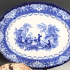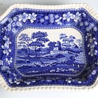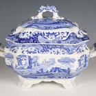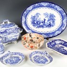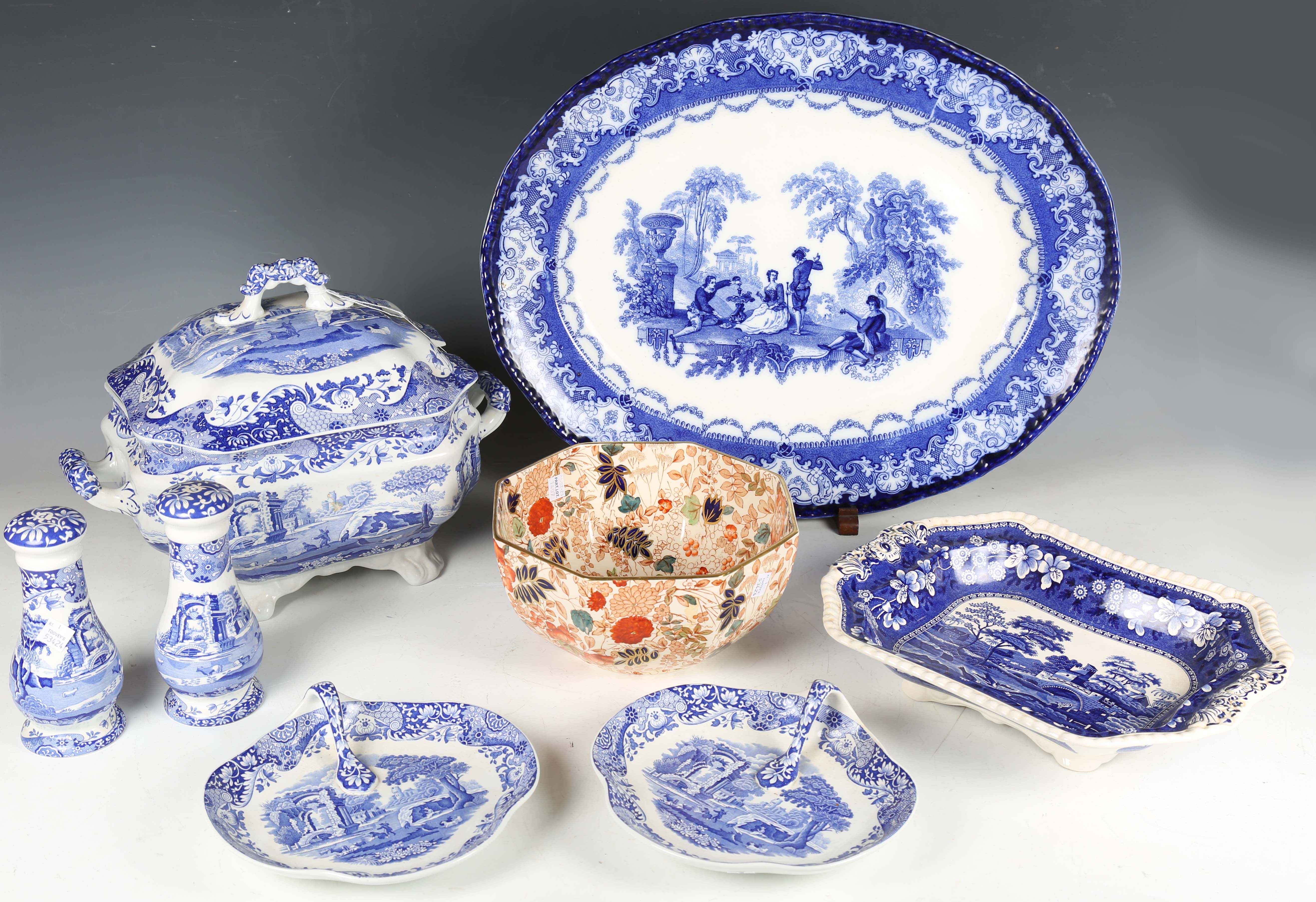 Five items of Spode blue printed Italian pattern tableware, comprising a rectangular soup tureen and cover, a pair of single-handled dishes, salt pot and pepper pot, together with a Doulton Watteau pattern blue printed oval platter, length 49.5cm, a Mason's Bittersweet pattern octagonal bowl and a Spode Blue Tower pattern tureen base.