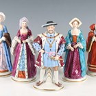 A set of Sitzendorf porcelain figures, modelled as Henry VIII and his six wives, each with painted name to the reverse edge of the base, underglaze blue factory mark to bases, height 20cm.