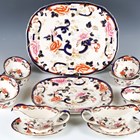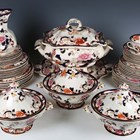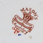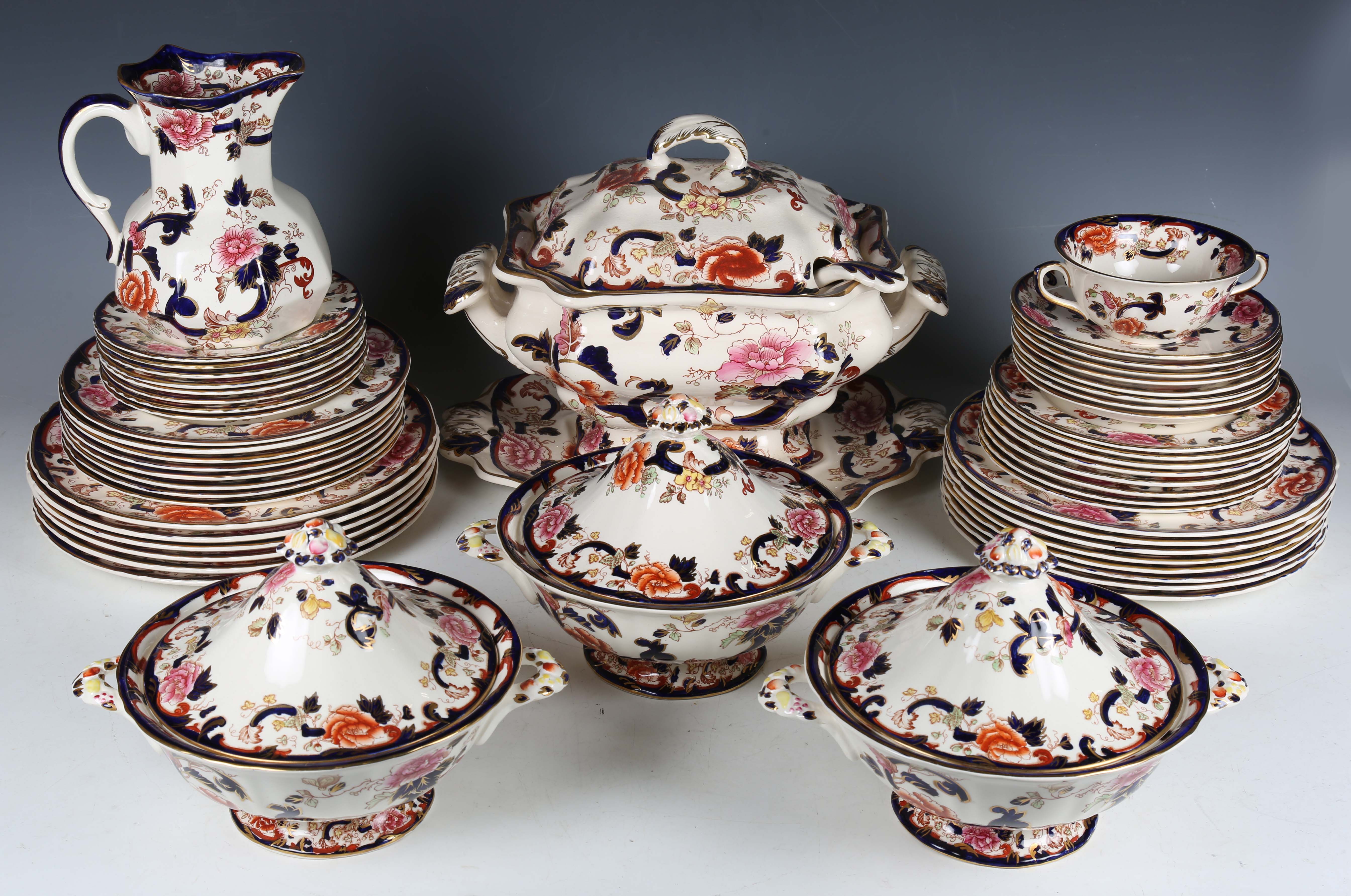 A Mason's Mandalay pattern part service, comprising two graduated oval platters, longest 43cm, three tureens and covers, soup tureen, cover and stand with ladle, six plates 26.5cm diameter, eight plates 25.3cm diameter, eight plates 22.8m diameter, eight plates 19.8cm diameter, two sauce boats and stands, eight plates 17.2cm diameter, eight two-handled soup bowls and stands and a jug, height 17cm (minor faults).