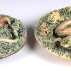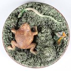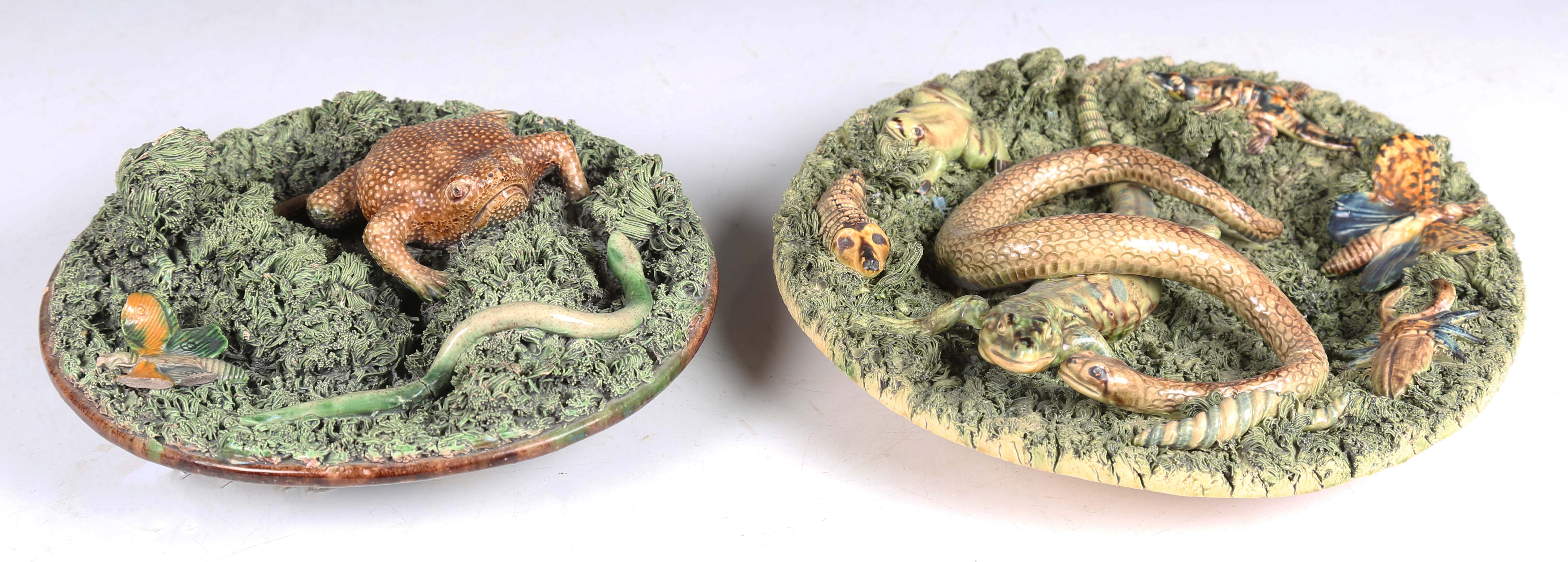 Two Caldas Rainha Portuguese pottery Palissy style dishes, late 19th century, the larger example by Jose A. Cunha with a lizard and snake surrounded by six other critters, diameter 24cm, the smaller example by D'Avellar with a toad, snake and butterfly, diameter 20cm, both with shredded clay grass ground, impressed marks to bases (some faults).