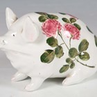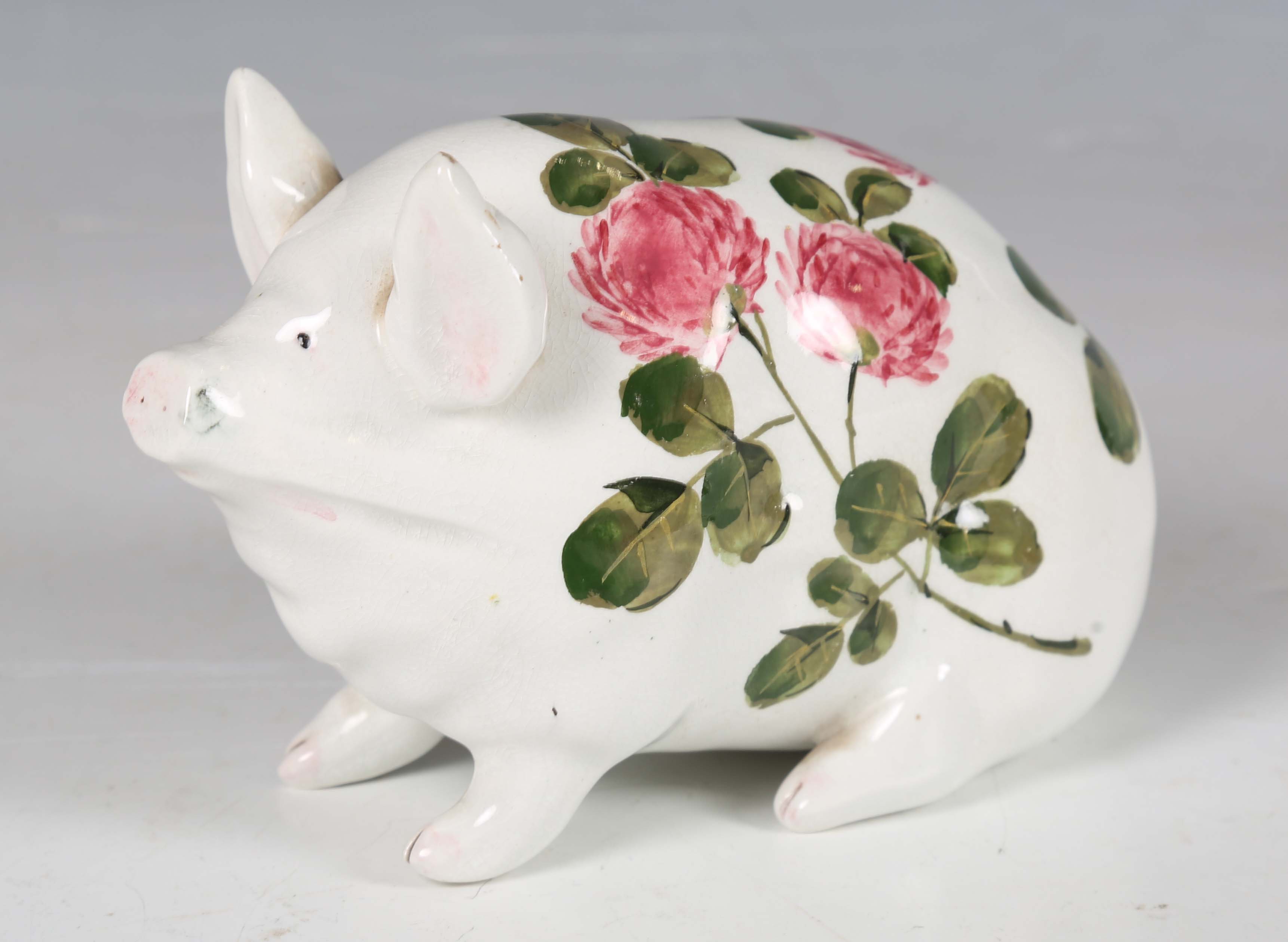 A small Wemyss pottery pig, post 1930, probably painted by Joe Nekola, with a design of pink flowering clover, green painted and printed marks to base, length 15cm.