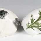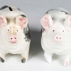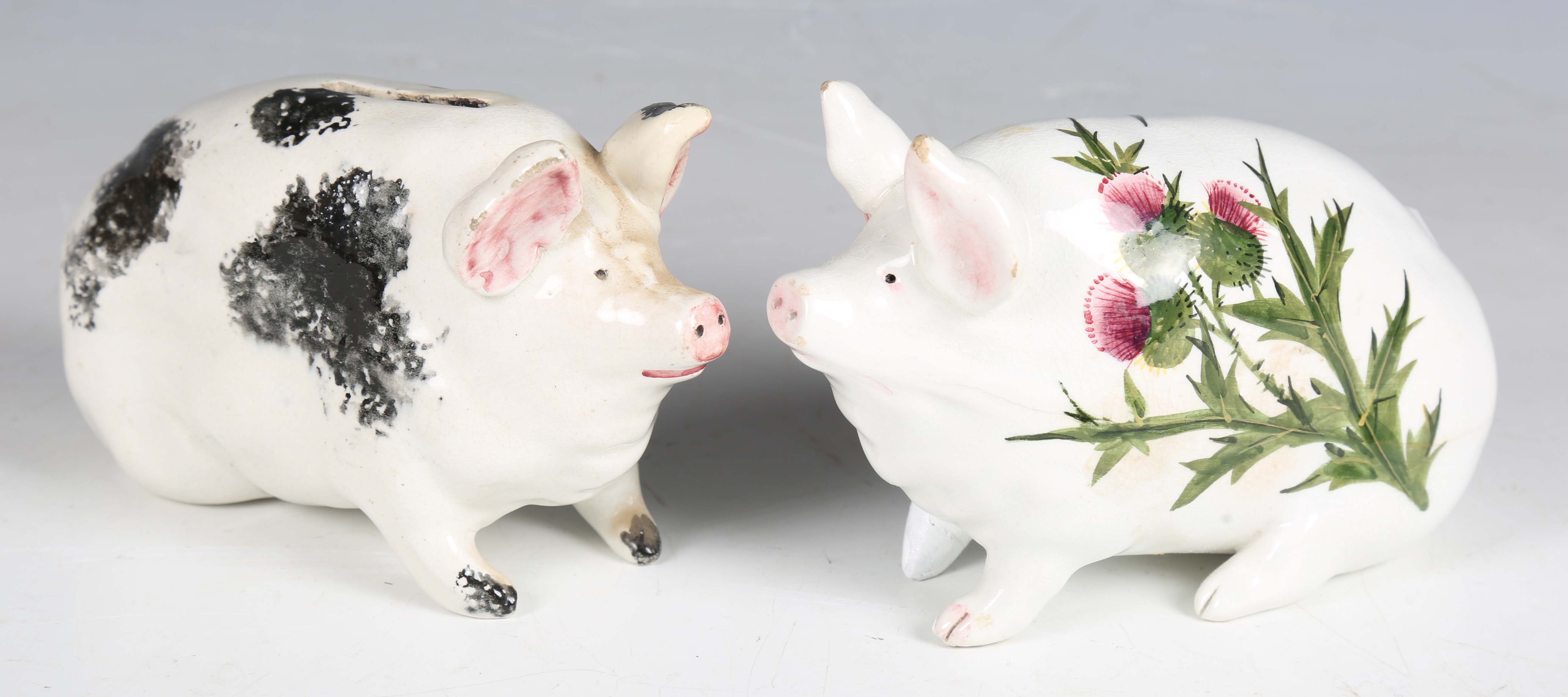 Two small Wemyss pottery pigs, early 20th century, the first a money box sponged with black markings, impressed mark to base, the second painted with thistles, green painted mark to base, both 15cm long (faults and restoration).