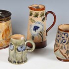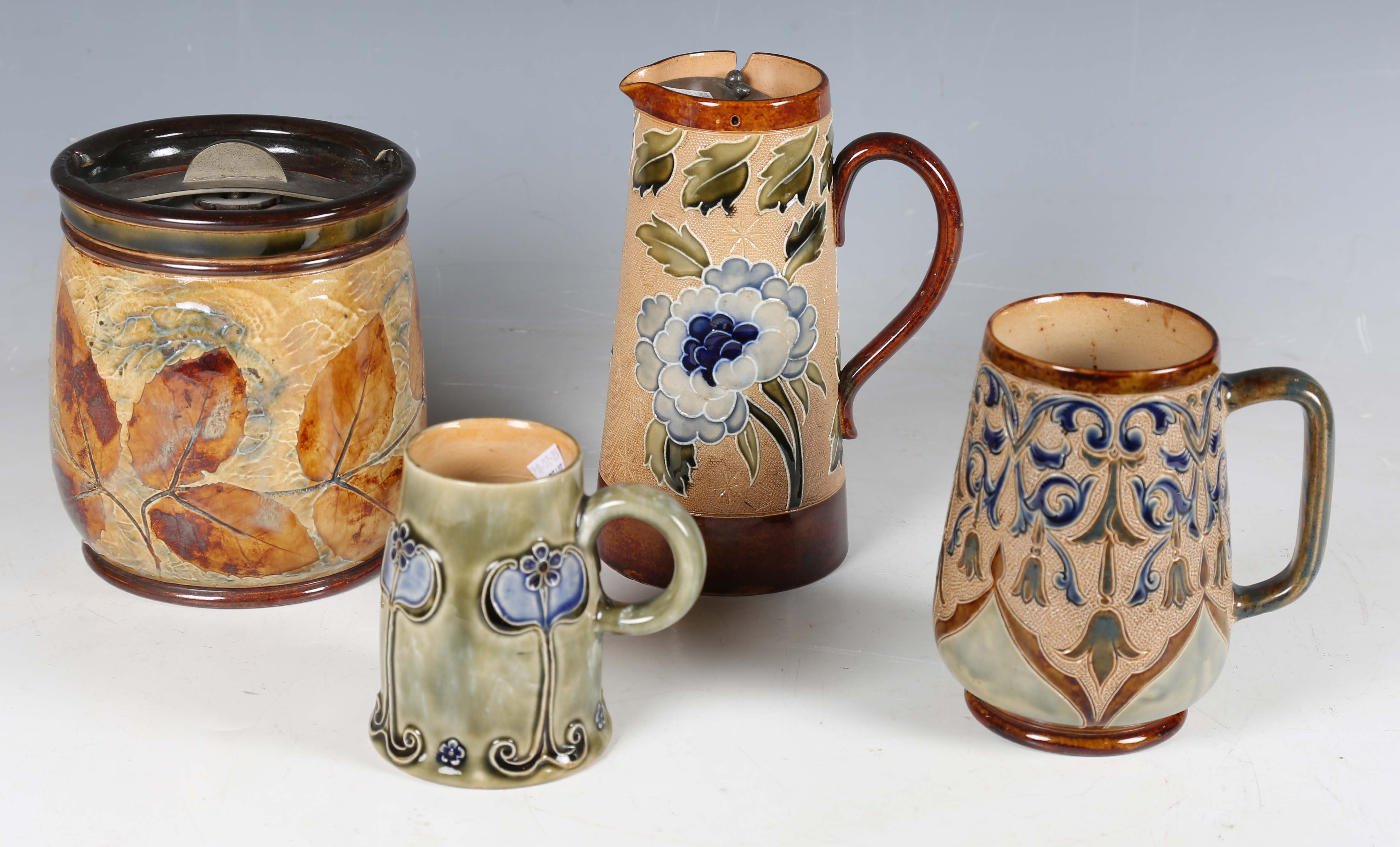 Four pieces of Doulton stoneware, comprising a mug with bellflower decoration against a textured ground and green glazed body, decorated by Arthur Beere, monogrammed, height 13.3cm, a smaller mug with Art Nouveau stems of flowering plants, height 10cm, a Natural Foliage tobacco jar and cover, height 14.5cm, and a Slater's Patent jug with pewter tappit lid, height 18cm.