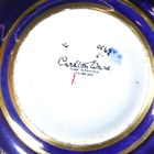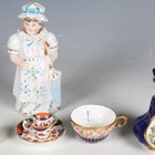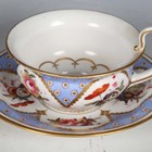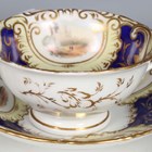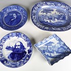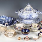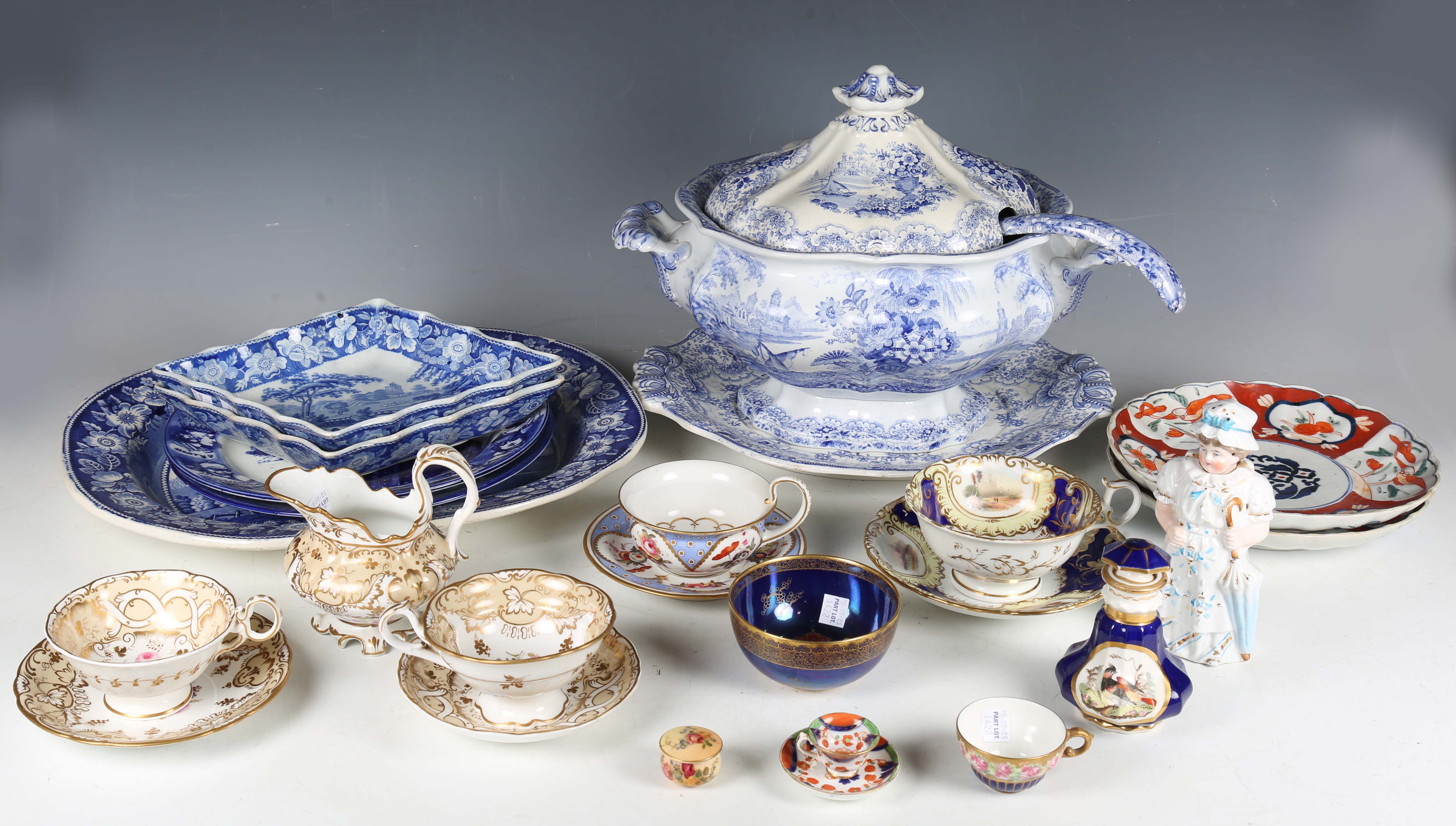 A mixed group of pottery and porcelain, mostly 19th century, including a blue printed soup tureen, cover and stand with a matched ladle, a Derby scent bottle and stopper painted with a bird panel against a cobalt blue ground, height 11cm, a Carlton Ware Chinaland pattern sugar bowl, diameter 10.5cm, a Royal Worcester blush ivory circular patch box and cover, two Japanese Imari scalloped rim dishes, diameter 22cm, two Royal Doulton blue printed series ware plates, a Wild Rose blue printed oval platter, length 40.5cm, and some cabinet cups and saucers including Davenport and Ridgway (faults and repairs).