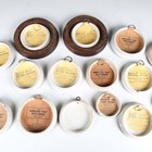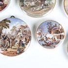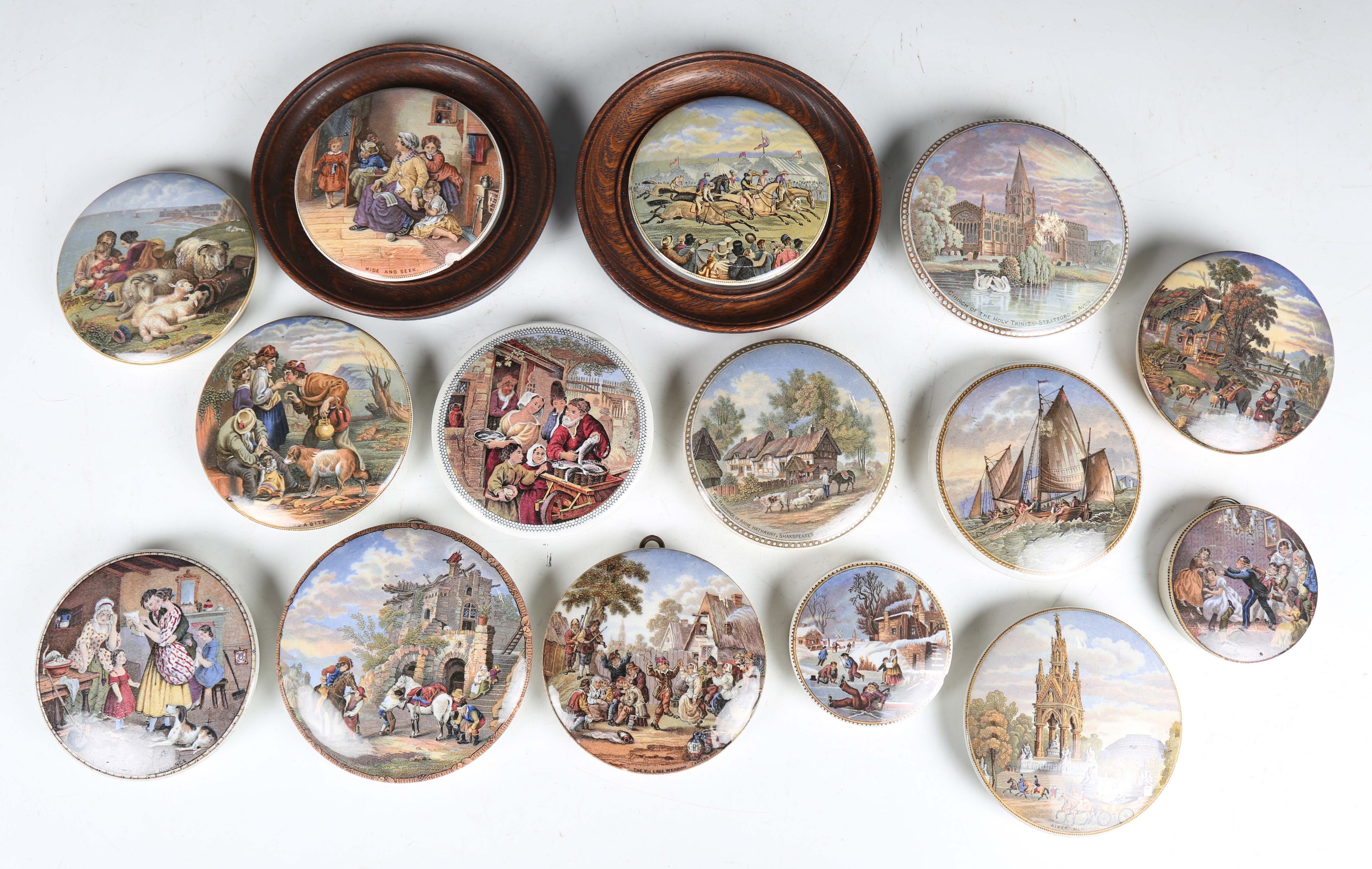 Fifteen assorted pot lids, 19th century, including Church of The Holy Trinity - Stratford on Avon, Hide and Seek, Derby Day and Dangerous Skating, all by F. & R. Pratt, with two wooden frames (faults).