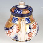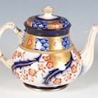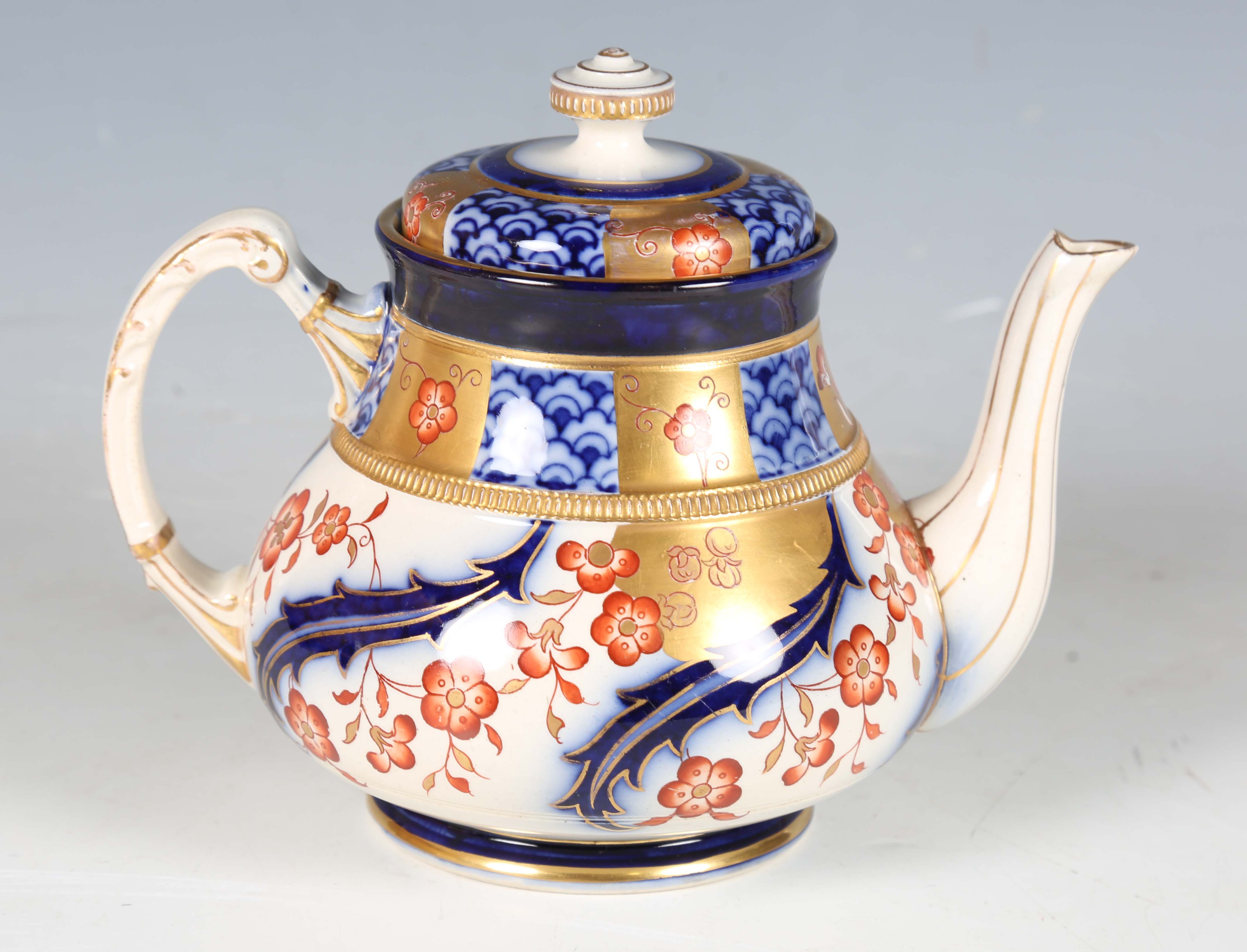 A James Macintyre Aurelian Ware teapot and cover, designed by Moorcroft circa 1897, with gilt enriched cobalt blue and iron red floral and scale decoration, blue printed, impressed and painted marks to base, height 15cm.