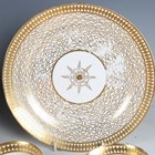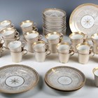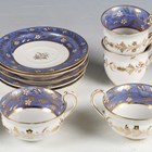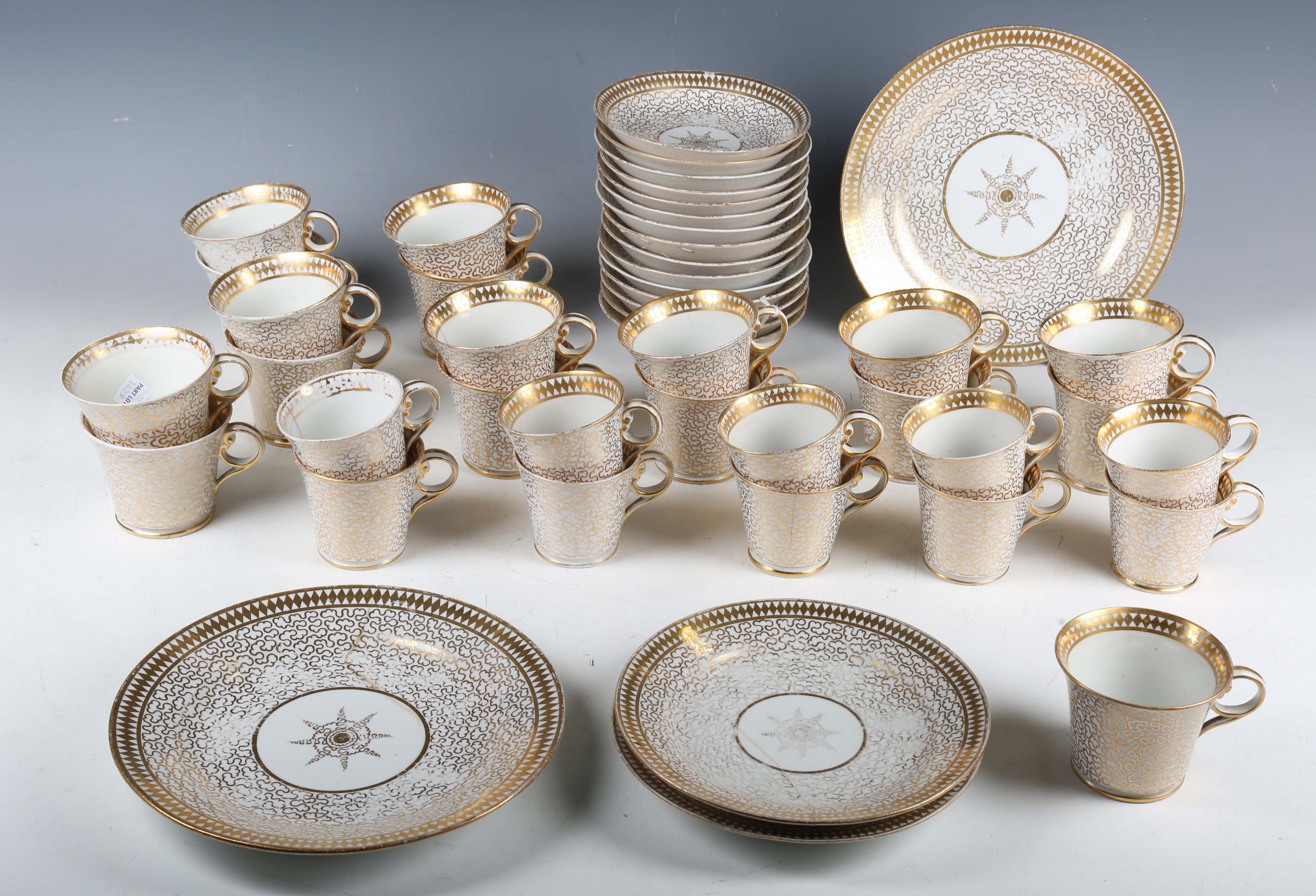 A Chamberlains Worcester part service, early 19th century, pattern No. 440, gilt overall with vermicelli beneath a diamond border, comprising seventeen teacups, ten coffee cups, fifteen saucers, two small plates and two larger plates, diameter 22cm, together with a small group of Empire shape tea and coffee wares gilt with floral stems against a powder blue ground (faults and repairs).