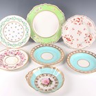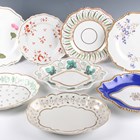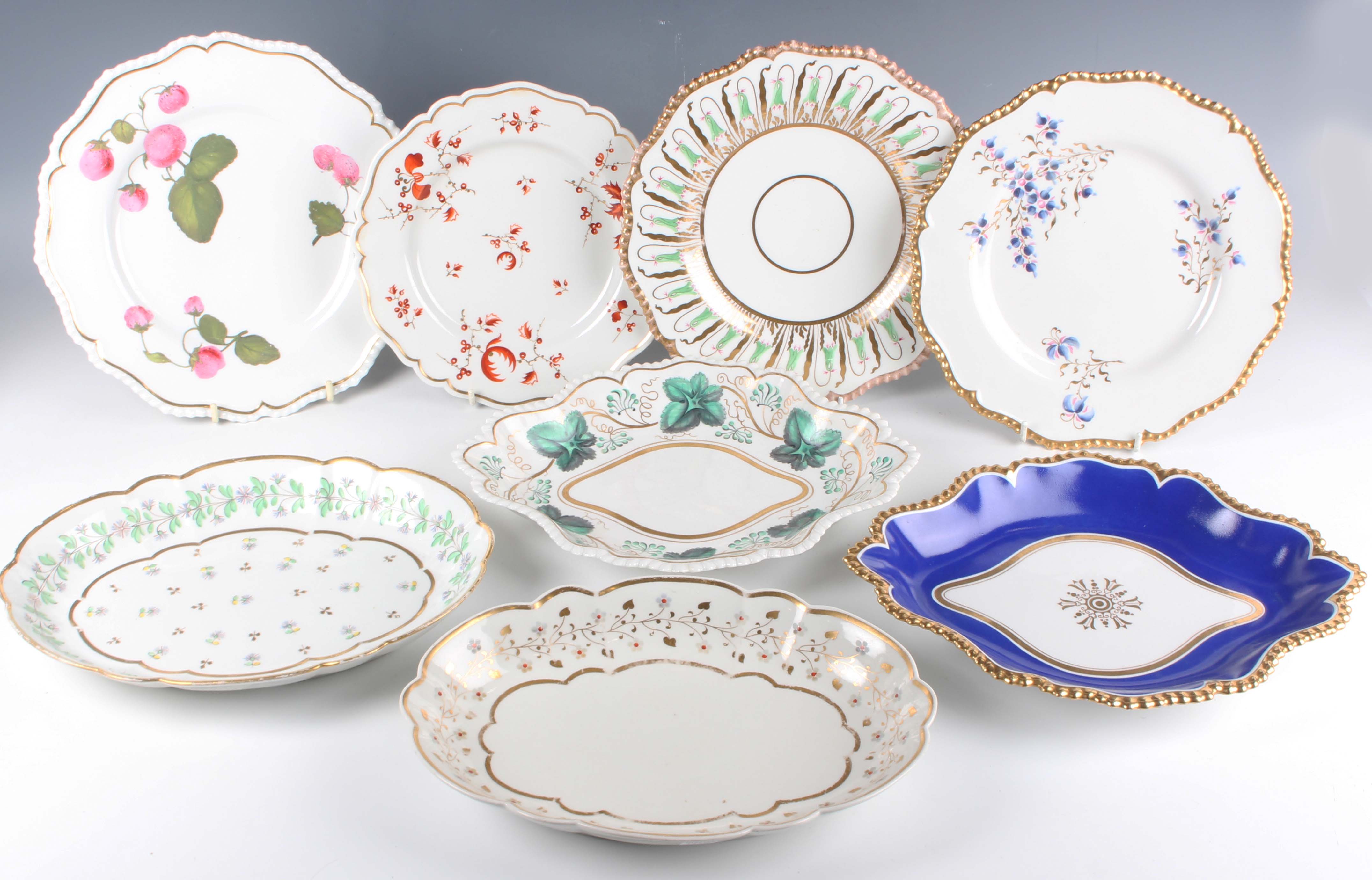 A mixed group of Flight & Barr Worcester tablewares, early 19th century, including a gadrooned rim plate painted with strawberries, diameter 26cm, two gilt gadrooned rim plates, the first painted and gilt with bellflowers to the rim, the second with scattered blue, pink and gilt floral stems, diameter of both 25cm, a green rimmed plate painted in sepia with hops, diameter 27cm, a pair of plates painted in iron red and gilt with floral and berried sprigs, diameter 22.5cm, two oval dishes, length 29cm, and a diamond shaped dish painted and gilt with vine leaves, length 29.5cm, various impressed and printed marks (some faults and restoration). Provenance: The Flight Collection.