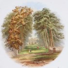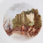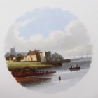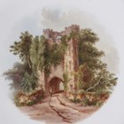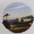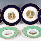 A set of four Flight, Barr & Barr Worcester named view topographical plates, early 19th century, painted with central views of The Gate Tower at Warwick Castle, Rolleston Hall, Guy’s Cliff and Ludlow Castle, within gilt edged cobalt blue rims, impressed marks and puce script titles to bases, diameter 24cm, together with a pair of Flight, Barr & Barr Worcester named view green ground topographical plates, titled Rivaux Abbey, Yorkshire and Leigh near Southend, within gilt gadrooned rims, puce printed and impressed marks to bases, diameter 22cm (minor faults). Provenance: The Flight Collection.