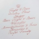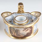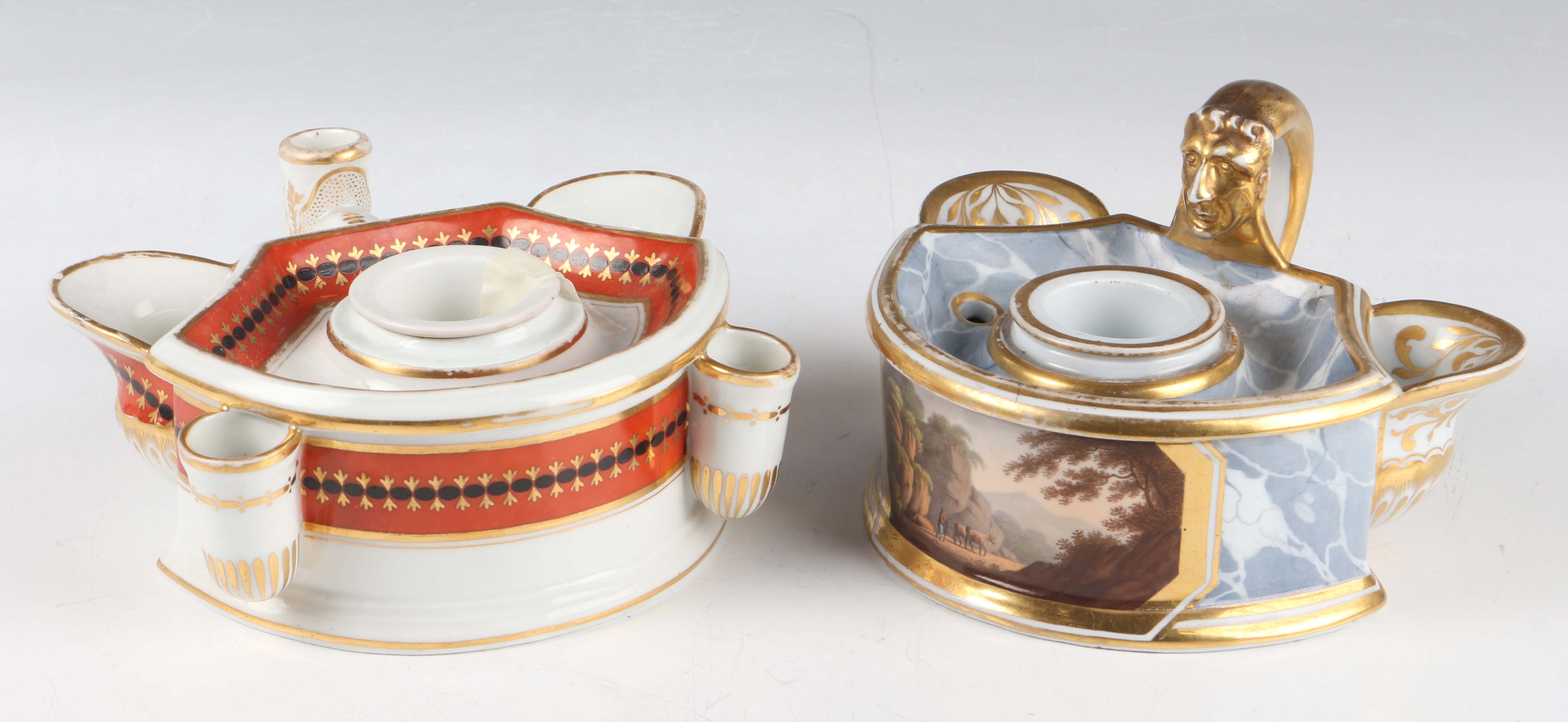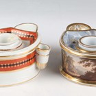 A Barr Flight & Barr Worcester inkstand, circa 1804-13, of hemispherical form, painted with a figure and two cows in a mountainous landscape within a grey pseudo marbled ground, the central well surrounded by three pen holders, the gilt loop handle with mask terminal flanked by two dip wells, puce painted marks to base, height 8cm, together with a similar Barr Worcester inkstand and well with orange, black and gilt decoration, incised mark to base, height 6cm (minor faults and restoration). Provenance: The Flight Collection.
