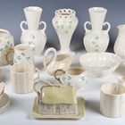 A group of Belleek tablewares, mainly late 20th century green and gold marks, including a pair of two-handled panelled vases painted with shamrocks, height 20cm, a similarly painted vase with pierced rim, height 19cm, heart shaped bowl, swan, a pair of Thorn pattern mugs, cottage shaped butter dish and cover, two Cone pattern teacups, a saucer and cream jug and a Tridacna jug, height 13.5cm (minor faults).