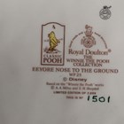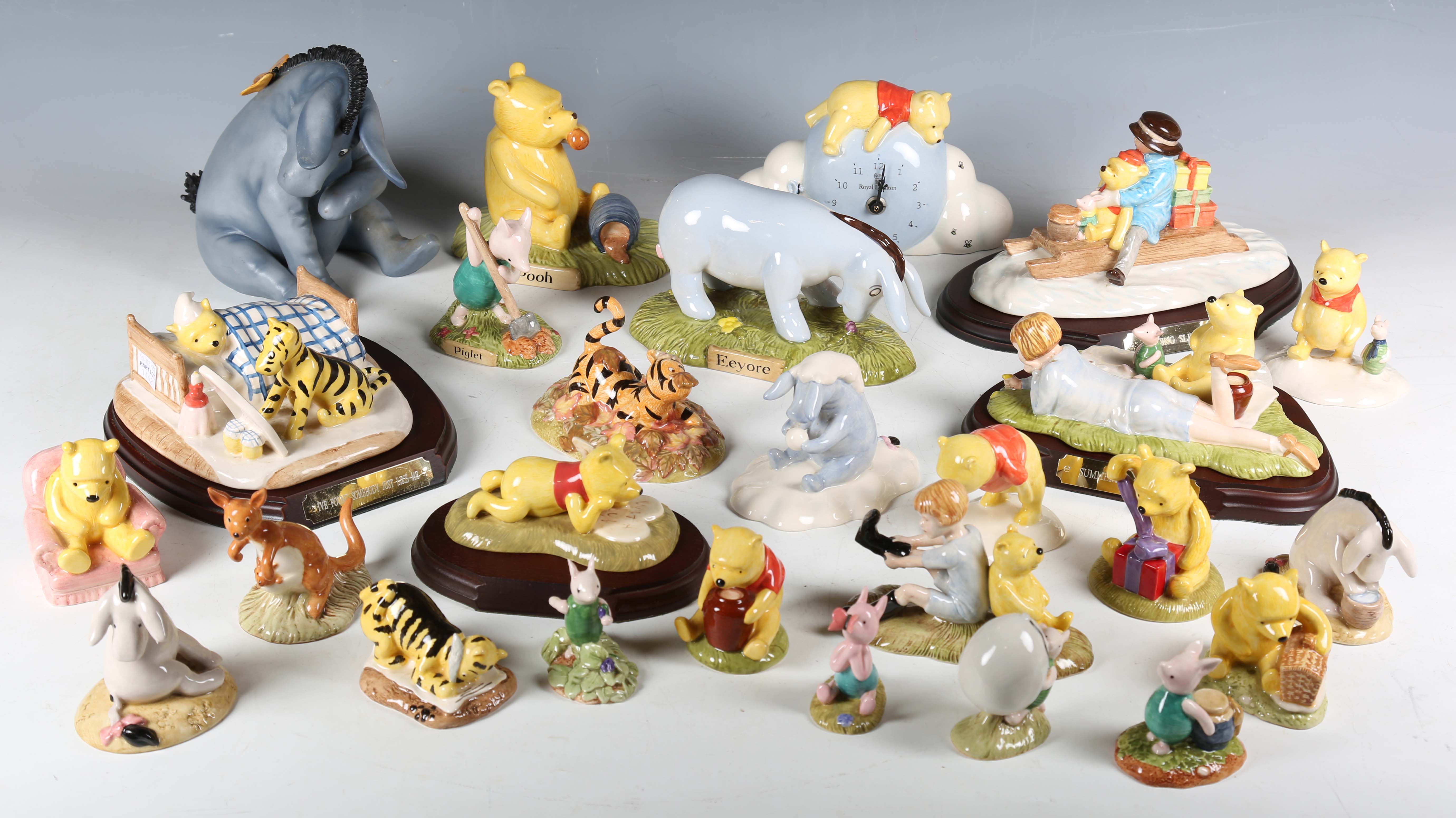Thirty-eight Royal Doulton Winnie-the-Pooh Collection figures and groups, including the seven limited editions I've Found Somebody Just Like Me, Eeyore Nose to the Ground, The Brain of Pooh, Pooh Began to Eat, Going Sledging, Summer's Day Picnic and Piglet Planting a Haycorn, each boxed, some with certificates, together with a Border Fine Arts Eeyore Money Bank, boxed, a small group of enamelled Classic Winnie The Pooh pin badges and a box of Pooh Bear picture dominoes.