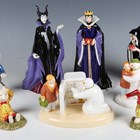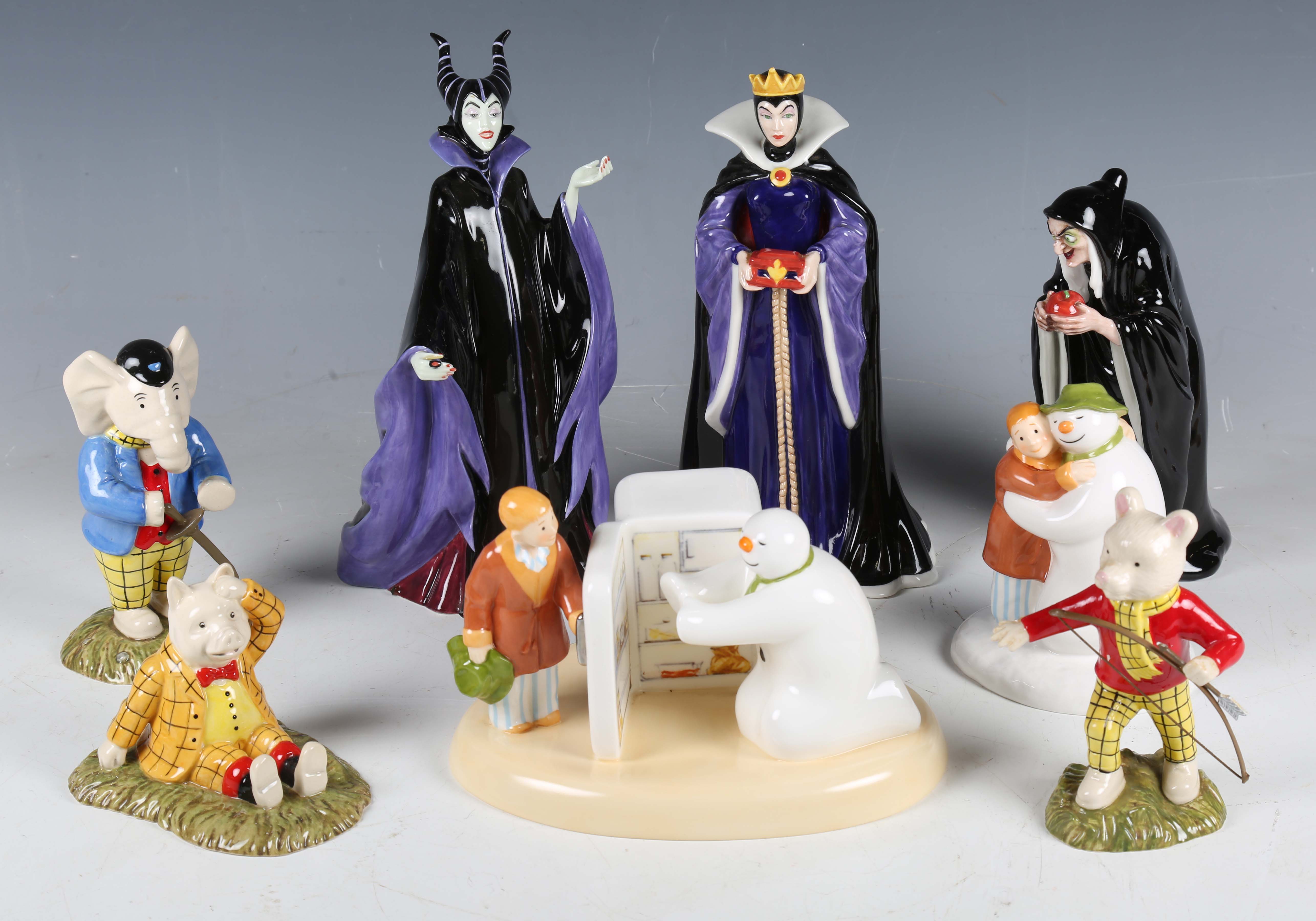 Three Royal Doulton The Disney Villains Collection limited edition figures, each from an edition of 2000, comprising The Queen from Snow White, HN3847, Maleficent from Sleeping Beauty, HN3840, and The Witch from Snow White, HN3848, each boxed with certificates, together with two Coalport Characters The Snowman collection figure groups, boxed, and three Royal Doulton Rupert figures, each boxed with certificates (flaking to red jacket of Rupert Finishing Arrows and Stringing His Bow).