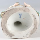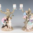A pair of Meissen porcelain twin candelabra, late 19th/early20th century, modelled as trees, the first with a man holding a nest handing eggs to a young girl, incised 1160 to base, and the second with a boy in the tree handing eggs from a nest to a seated woman, incised 1153 to base, crossed swords marks in blue to bases with various other painted, impressed and incised marks, height 23cm (faults and losses).