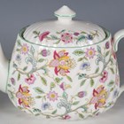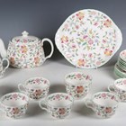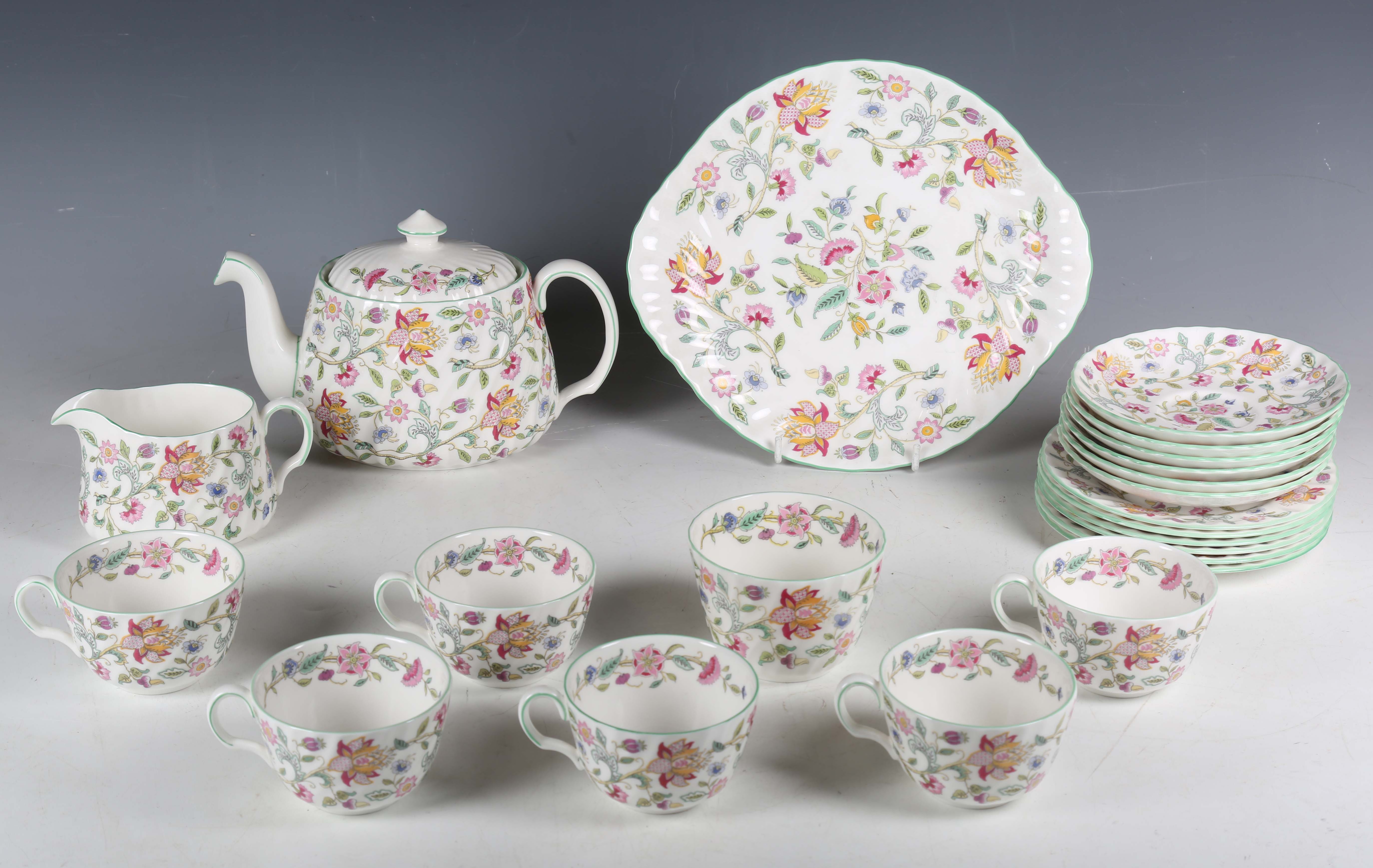 A Minton Haddon Hall pattern part service, comprising teapot and cover, milk jug, sugar bowl, six teacups and saucers, six tea plates and a bread and butter plate.