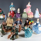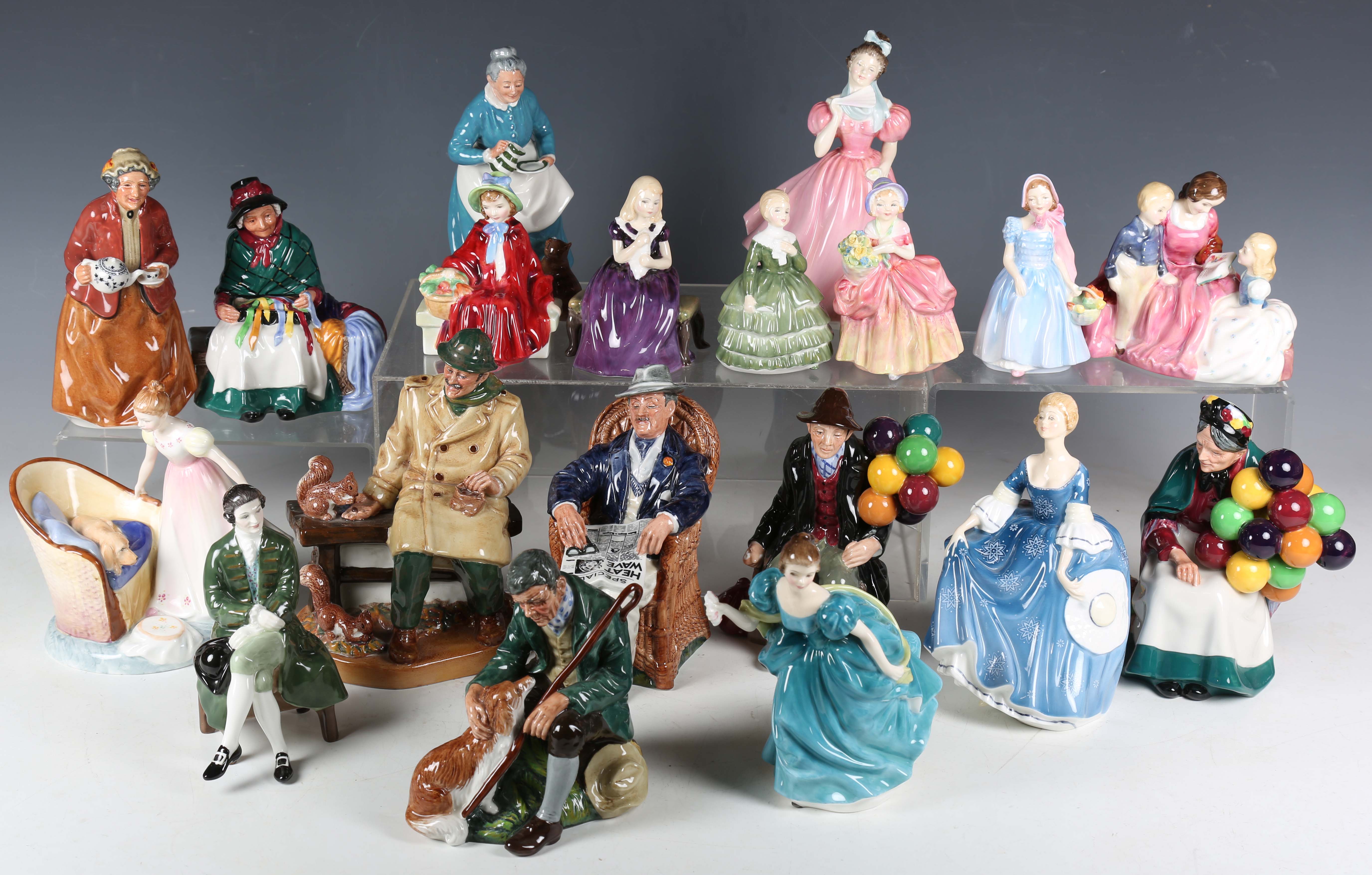Nineteen Royal Doulton figures, comprising Hilary, HN2335, The Old Balloon Seller, HN1315, The Balloon Man, HN1954, A Gentleman From Williamsburg, HN2227, Lunchtime, HN2485, Rhapsody, HN2267, The Bedtime Story, HN2059, Taking Things Easy, HN2677, Beat You To It, HN2871, Silks and Ribbons, HN2017, Teatime, HN2255, The Favourite, HN2249, The Master, HN2325, Wendy, HN2109, Cissie, HN1809, Affection, HN2236, Belle, HN2340, Linda, HN2106, and Camellia, HN2222.