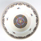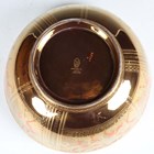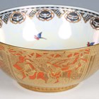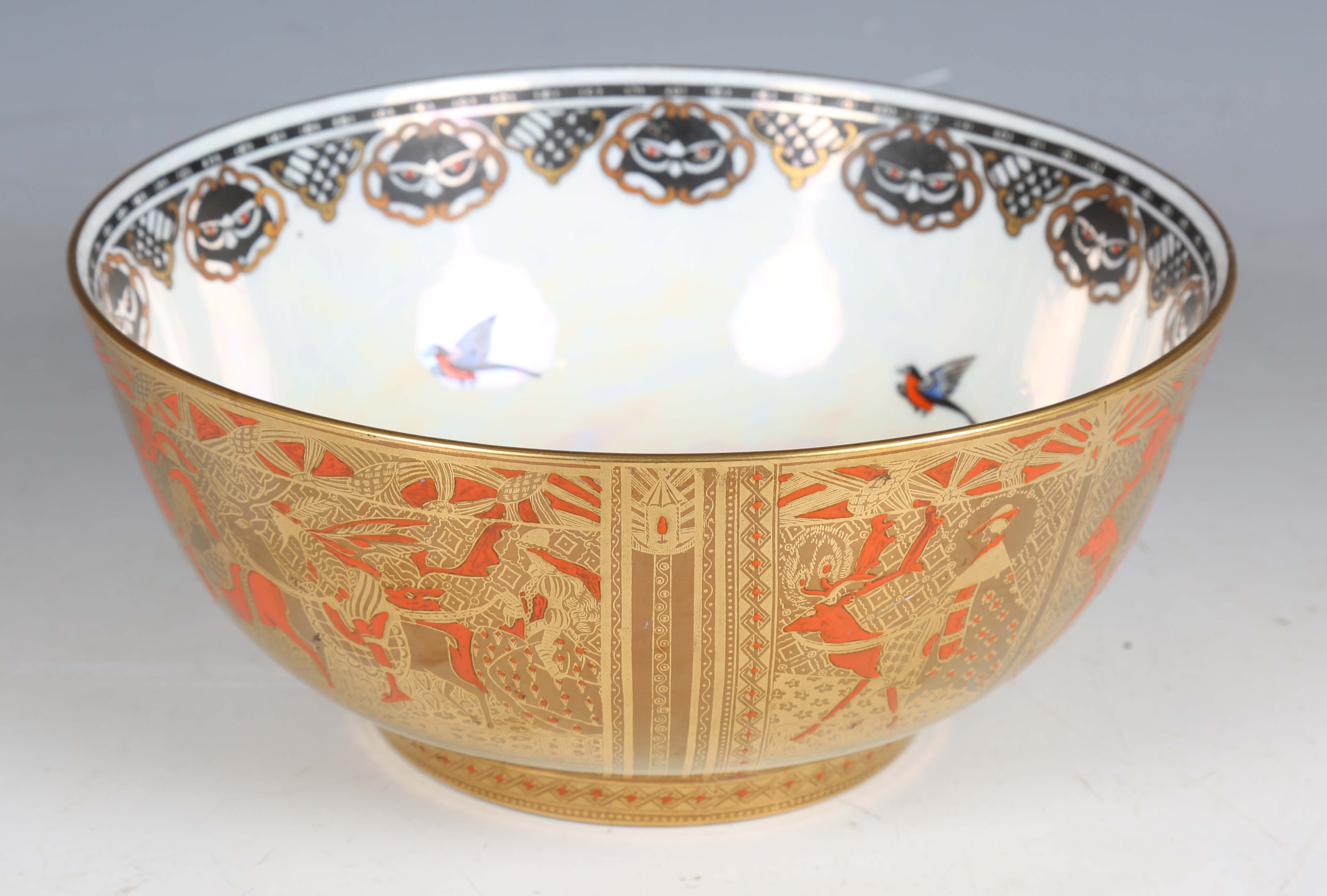 A Wedgwood Coral and Bronze Fairyland lustre Imperial circular bowl, circa 1925, designed by Daisy Makeig-Jones, decorated in the Willow pattern, the mother-of-pearl lustre interior with a band of magpies and masks around a central base checker rosette, gold printed Portland Vase mark to base underside and painted pattern No. Z5349, diameter 23.3cm.