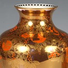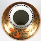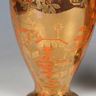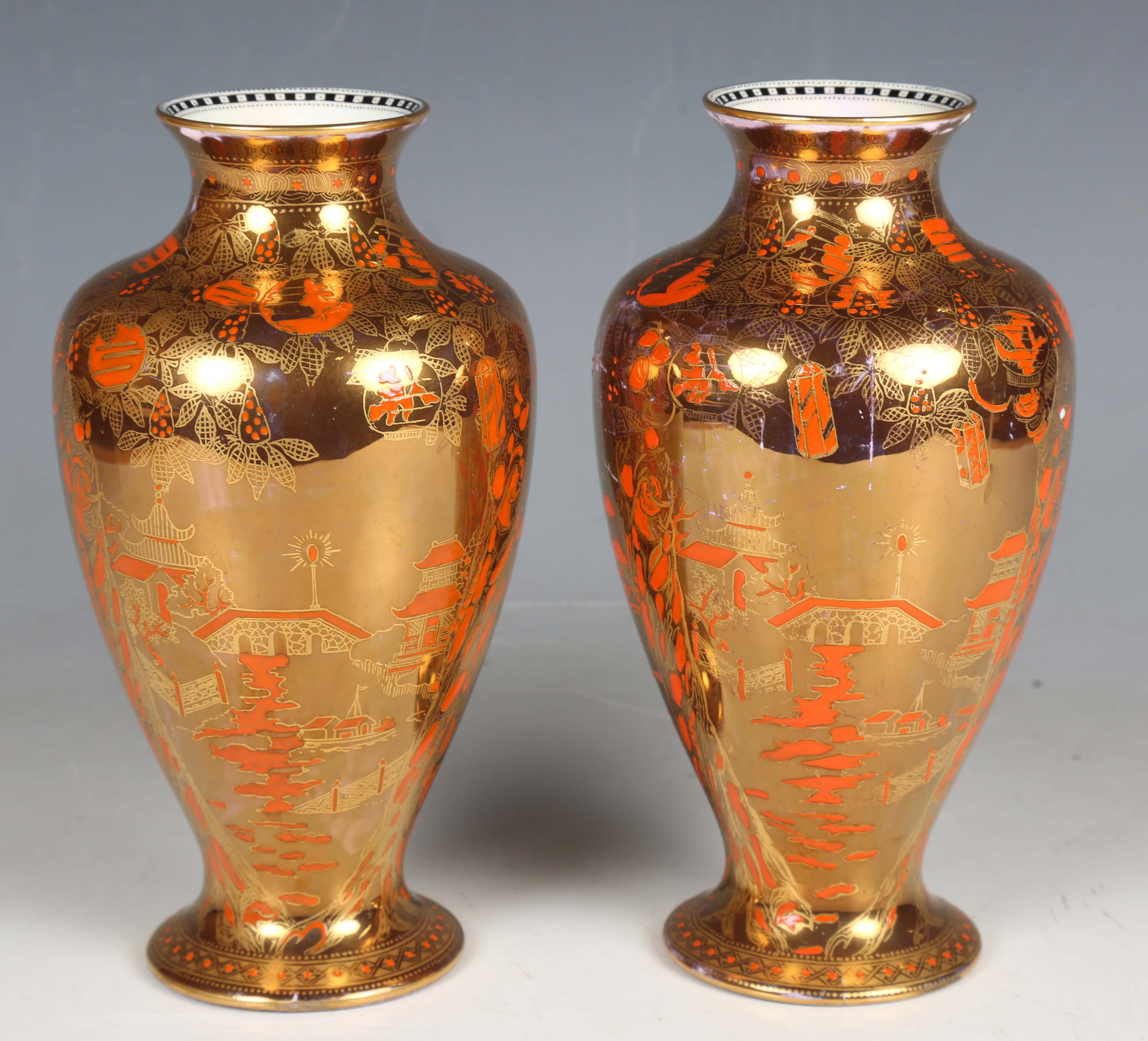 A pair of Wedgwood Coral and Bronze Fairyland lustre vases, circa 1925, designed by Daisy Makeig-Jones, shape No. 2034, decorated in the Willow pattern, the mother-of-pearl lustre interiors with a simple black and white band to the inner rim, gold printed Portland Vase mark to bases and painted pattern No. Z5349, height 21.5cm.