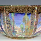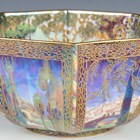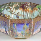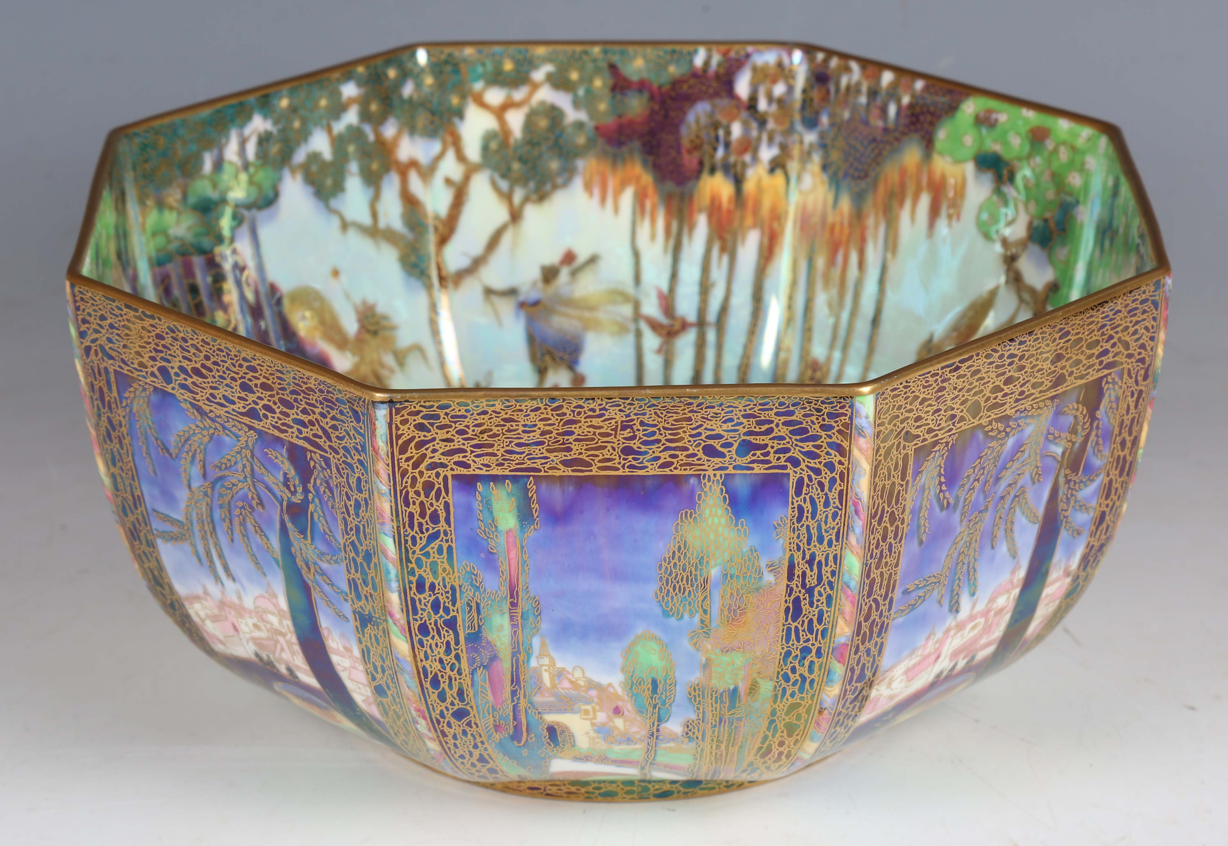 A Wedgwood Fairyland lustre octagonal bowl, circa 1920, designed by Daisy Makeig-Jones, the interior decorated with the Woodland Elves VIII Boxing Match pattern, the exterior with the Castle on a Road pattern within gilt cobble frame borders, gilt printed Portland Vase mark to base and painted pattern No. Z5125, diameter 27cm.