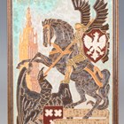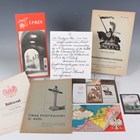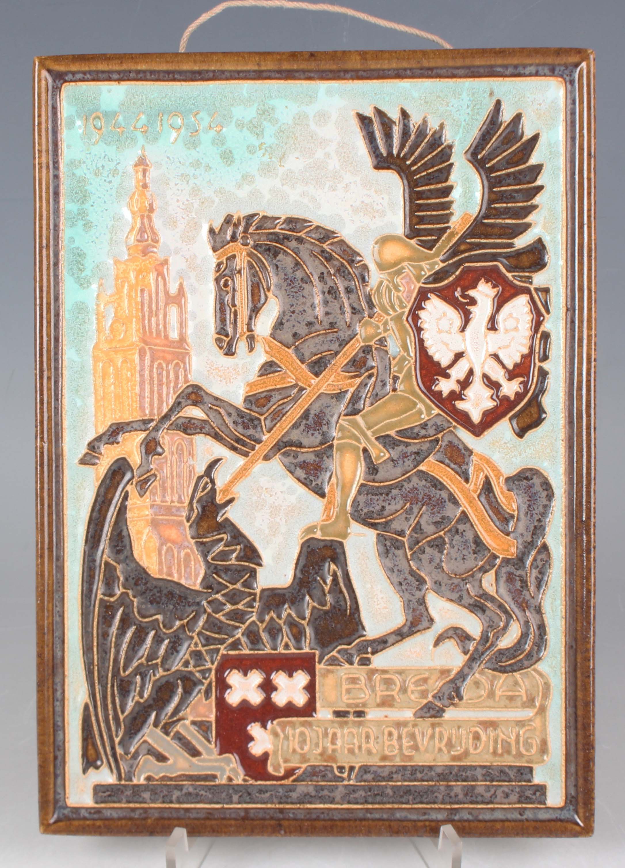 A De Porcelyn Fles Delft pottery commemorative cloisonné tile, dated 1954, commemorating the liberation of Axel, Netherlands, by the Ist Polish Armoured Division, depicting a knight on horseback, impressed marks to reverse, 20.3cm by 14.5cm, with accompanying literature, ephemera and paperwork.